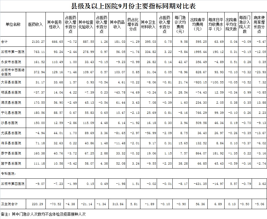 1.医药收入:9月份12家总医院医药总收入27249.17万元,比去年同期25118.90万元,增加2130.27万元,增长8.48%。其中:医疗服务性收入10848.61万元,占医药收入39.81%(床位收入710.11万元、手术治疗护理等服务收入10138.50万元),比去年同期10181.96万元, 医疗服务性收入增加666.65万元,增长6.55%;药品收入6446.81万元,比去年同期6265.78万元,增加181.03万元,增长2.89%。