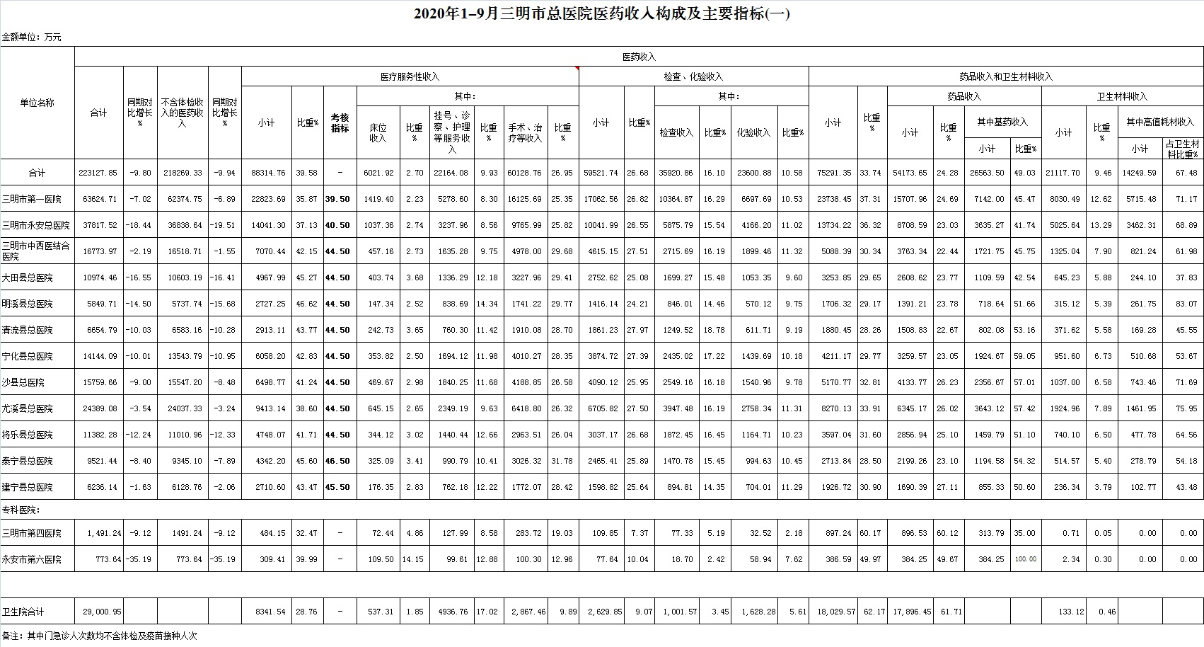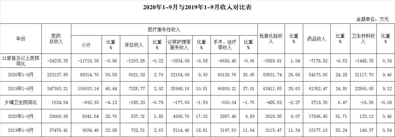 (一)1-9月份12家总医院运行情况:医药总收入223127.85万元,比去年同期247363.21万元减少24235.35万元,下降9.80%(不含体检收入的医药收入为218269.33万元,比去年同期242361.00万元减少24091.67万元,下降9.94%)。其中:医疗服务性收入88314.76万元,占医药收入39.58%(床位收入6021.92万元、手术治疗护理等服务收入82292.84万元),比去年同期100033.14万元,医疗服务性收入减少11718.38万元,下降11.71%;检查化验收入59521.74万元,占医药收入26.68%,同比下降6.13%;药品收入54173.65万元,药占比24.28%,分别比去年同期下降11.70%、下降0.52个百分点;卫生材料收入21117.70万元(其中高值耗材收入14249.59万元),占医药总收入9.46%,比去年同期9.12%,增长0.34个百分点。入院人次201136人次,比去年同期241018人次,减少39882人次,下降16.55%;门急诊人次4479705人次,比去年同期4952517人次,减少472812人次,下降9.55%;每门诊次均费用195.77元,比去年同期190.97元,增加4.80元,增长2.51%;出院者平均费用6427.86元,比去年同期6186.72元,增加241.14元,增长3.90%。