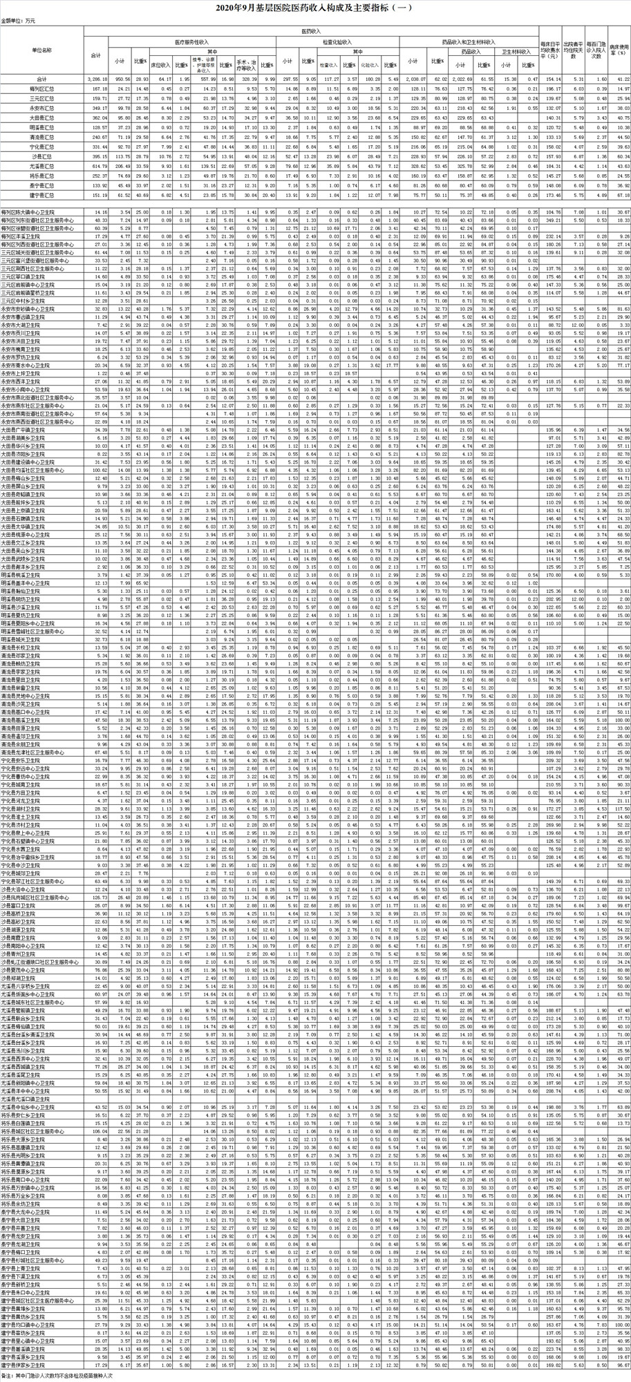 1-9月份基层医疗机构医药总收入29000.95万元(其中村所收入3481.39万元),去年同期27476.41万元,同比增加1524.54万元,增长5.55%,其中:医疗服务性收入8341.54万元,占医药收入28.76%(床位收入537.31万元、手术治疗护理等服务收入7804.22万元),去年同期9034.46万元, 医疗服务性收入同比减少692.93万元,下降7.67%;检查化验收入2629.85万元,同比下降15.59%;药品收入17896.45万元,去年同期15177.10万元,同比增加2719.35万元,增长17.92%,药占比61.71%,去年同期55.24%,同比增长6.47个百分点;卫生材料收入133.12万元,较去年同期149.37万元,同比减少16.26万元,占医药收入0.46%,较去年同期0.54%,同比下降0.08个百分点。入院人次60138人次,去年同期80941人次,同比减少20803人次,下降25.70%,其中明溪县、将乐县、大田分别下降53.89%、36.94%、35.17%、;门急诊人次3678268人次(其中村所门急诊1287522人次),去年同期3508868人次,同比增加169400人次,增长4.83%(基层诊疗量占比为45.09%,较去年同期的41.47%增长3.62个百分点);每门诊次均费用65.64元,去年同期60.30元,同比增加5.34元,增长8.86%;出院者平均费用813.97元,去年同期781.11元,同比增加32.86元,增长4.21%。