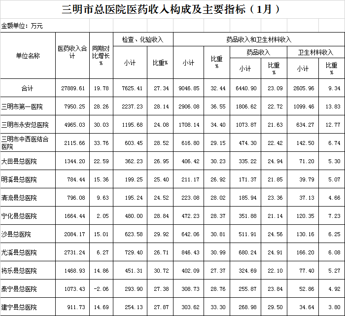 医药总收入。1-1月份12家总医院医药总收入同比增长19.78%(不含体检收入的医药收入同比增长19.51%),增长率超过考核要求的有8家总医院,其中市中西医结合医院同比增长33.78%、永安市总医院同比增长30.03%、市第一医院同比增长28.26%。