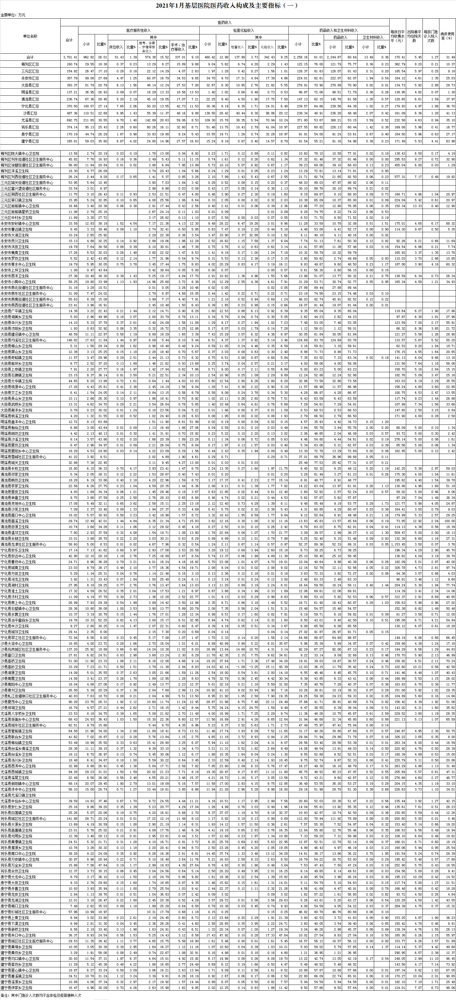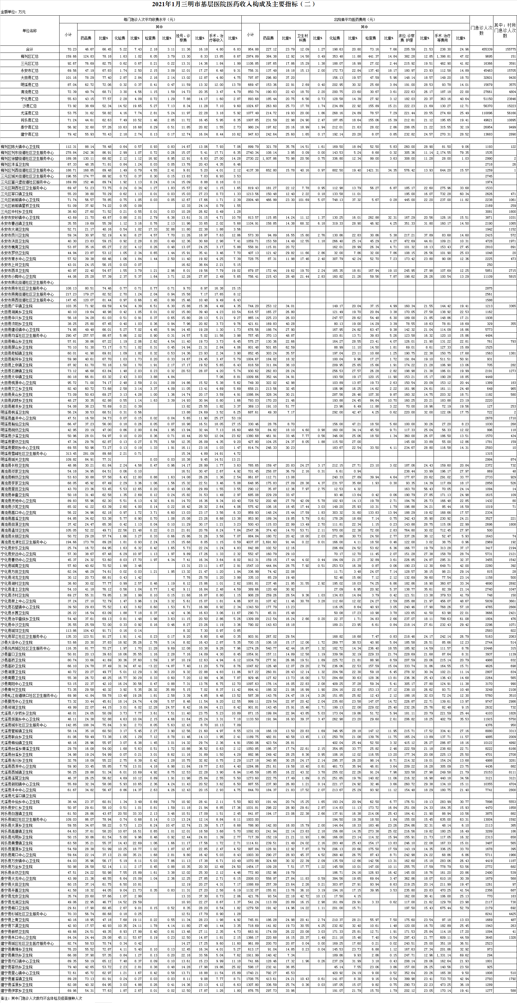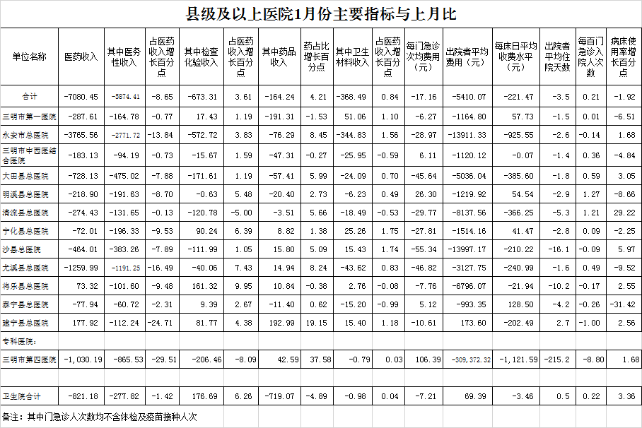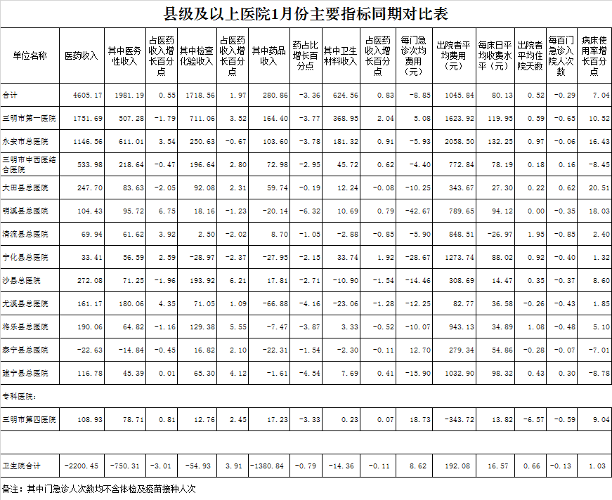 1月份基层医疗机构医药总收入3701.41万元(其中村所收入402.97万元),去年同期3311.01万元,同比增加390.40万元,增长11.79%,其中:医疗服务性收入962.82万元,占医药收入26.01%(床位收入51.43万元、手术治疗护理等服务收入911.39万元),去年同期969.68万元, 医疗服务性收入同比减少6.85万元,下降0.71%;检查化验收入480.42万元,同比增长62.17%;药品收入2244.67万元,去年同期2029.04万元,同比增加215.64万元,增长10.63%,药占比60.64%,去年同期61.28%,同比下降0.64个百分点;卫生材料收入13.49万元,较去年同期16.05万元,同比减少2.56万元,占医药收入0.36%,较去年同期0.48%,同比下降0.12个百分点。入院人次5767人次,去年同期6959人次,同比减少1192人次,下降17.13%,其中明溪县、三元区、大田县分别下降81.97%、59.8%、32.52%;门急诊人次455339人次(其中村所门急诊155775人次),去年同期449254人次,同比增加6085人次,增长1.35%(基层诊疗量占比为43.61%,较去年同期的46.61%下降3个百分点);每门诊次均费用70.23元,去年同期62.41元,同比增加7.82元,增长12.54%;出院者平均费用954.88元,去年同期709.22元,同比增加245.66元,增长34.64%。