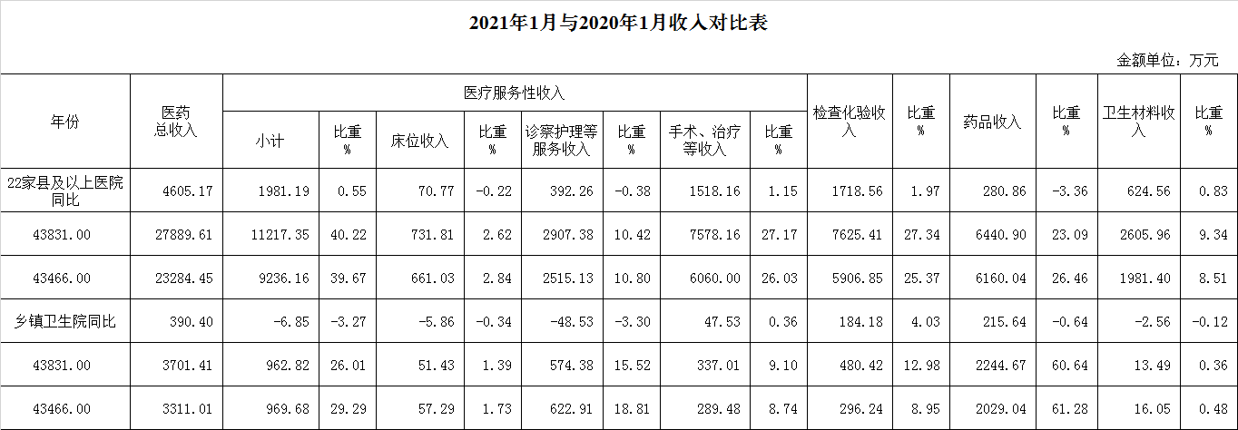 (一)1月份12家总医院运行情况:医药总收入27889.61万元,比去年同期23284.45万元增加4605.17万元,增长19.78%(不含体检收入的医药收入为27324.01万元比去年同期22864.06万元增加4458.95万元,增长19.51%)。其中:医疗服务性收入11217.35万元,占医药收入40.22%(床位收入731.81万元、手术治疗护理等服务收入10485.54万元),比去年同期9236.16万元,医疗服务性收入增加1981.19万元,增长21.45%;检查化验收入7625.41万元,占医药收入27.34%,同比增长29.09%;药品收入6440.90万元,药占比23.09%,分别比去年同期增长4.56%、下降3.36个百分点;卫生材料收入2605.96万元(其中高值耗材收入1869.56万元),占医药总收入9.34%,比去年同期8.51%,增长0.83个百分点;入院人次24276人次,比去年同期22725人次,增加1551人次,增长6.83%;门急诊人次588732人次,比去年同期514618人次,增加74114人次,增长14.40%;每门诊次均费用176.30元,比去年同期185.15元,减少8.85元,下降4.78%;出院者平均费用6690.10元,比去年同期5644.26元,增加1045.84元,增长18.53%。