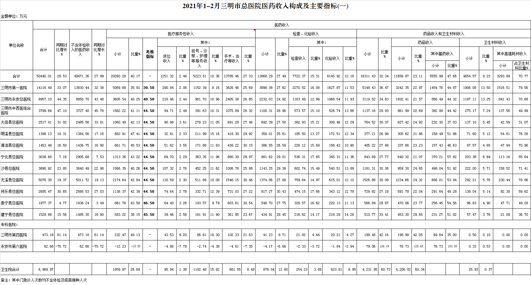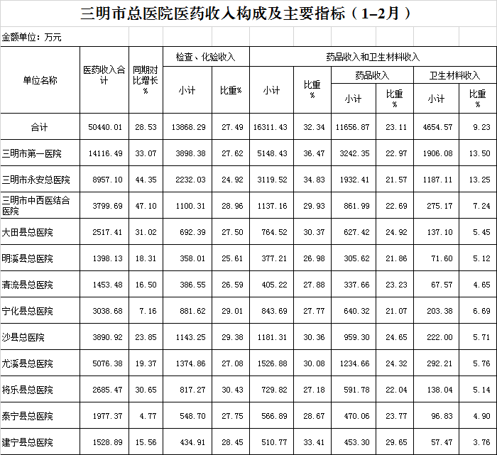 医疗服务性收入占比。1-2月份12家总医院医疗服务性收入占医药总收入40.17%,其中:市第一医院39.50%、三明市永安总医院40.25%、市中西医结合医院41.11%、大田县总医院42.13%、明溪县总医院47.41%、清流县总医院45.53%、宁化县总医院43.22%、沙县总医院40.26%、尤溪县总医院42.84%、将乐县总医院42.39%、泰宁县总医院43.58%、建宁县总医院38.15%,仅市第一医院、永安总医院、市中西医结合医院、大田县总医院完成考核指标。
