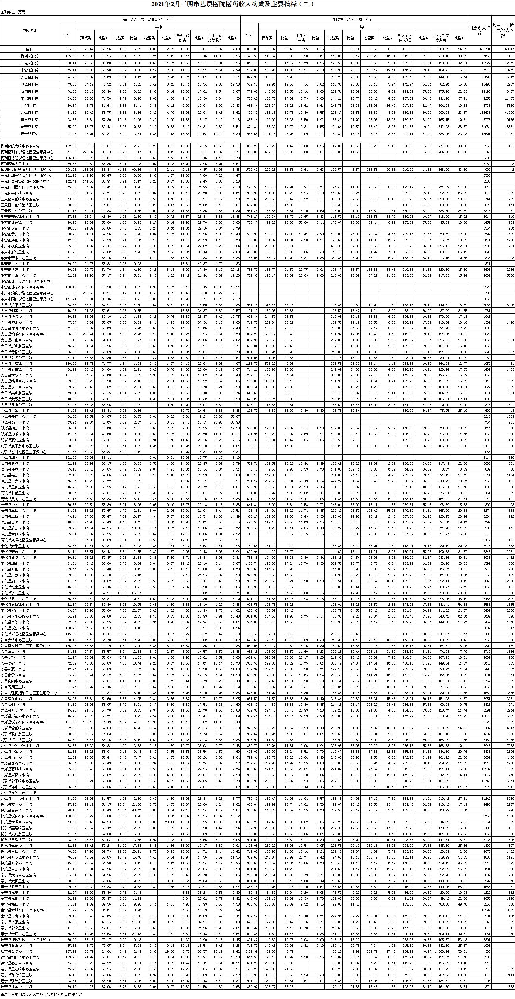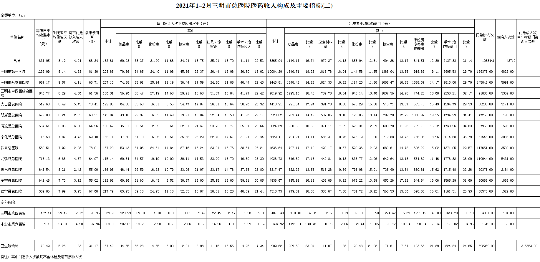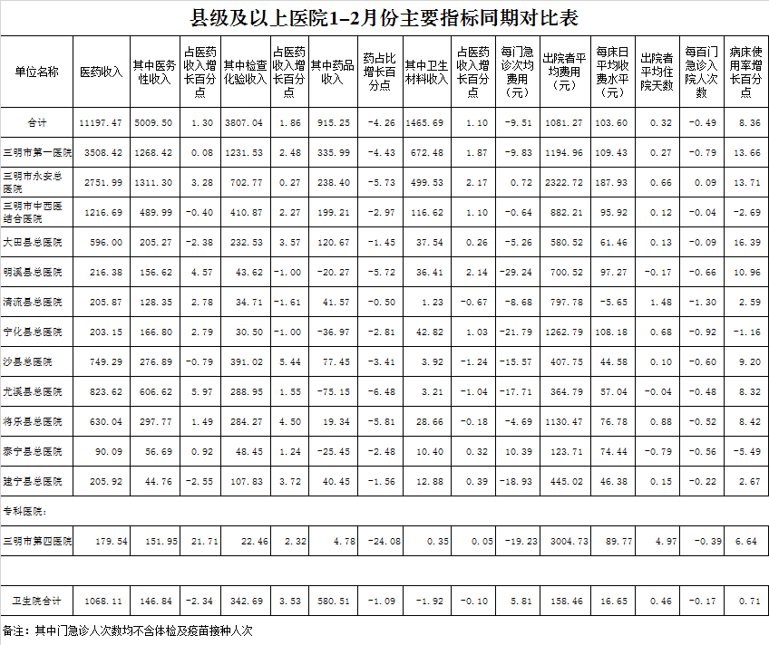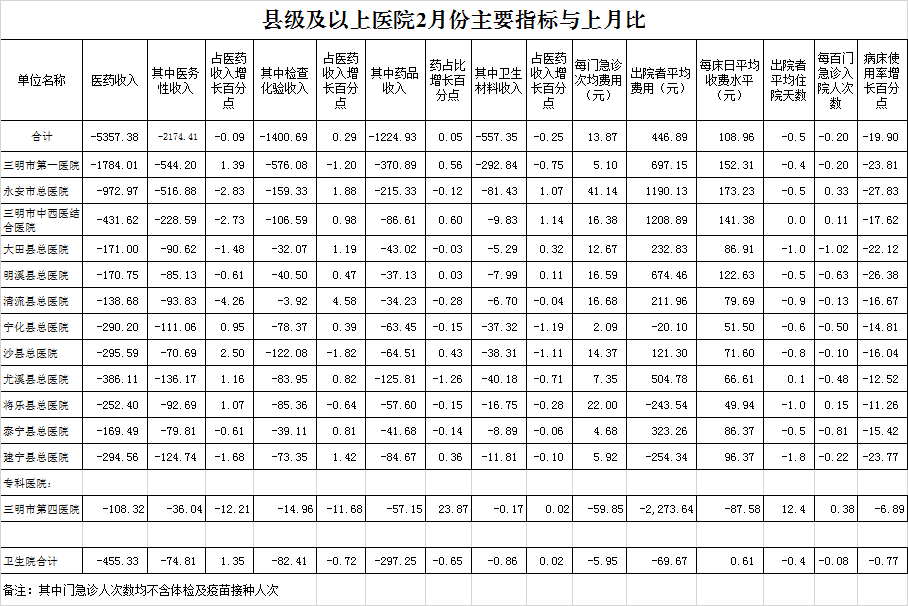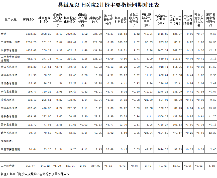 1-2月份基层医疗机构医药总收入6969.97万元(其中村所收入846.71万元),去年同期5901.86万元,同比增加1068.11万元,增长18.10%,其中:医疗服务性收入1859.97万元,占医药收入26.69%(床位收入95.94万元、手术治疗护理等服务收入1764.03万元),去年同期1713.14万元, 医疗服务性收入同比增加146.84万元,增长8.57%;检查化验收入878.04万元,同比增长64.01%;药品收入4206.02万元,去年同期3625.52万元,同比增加580.51万元,增长16.01%,药占比60.34%,去年同期61.43%,同比下降1.09个百分点;卫生材料收入25.93万元,较去年同期27.85万元,同比减少1.92万元,占医药收入0.37%,较去年同期0.47%,同比下降0.10个百分点。入院人次10949人次,去年同期11459人次,同比减少510人次,下降4.45%,其中明溪县、三元区、大田县分别下降76.07%、58.13%、19.78%;门急诊人次892959人次(其中村所门急诊315553人次),去年同期819643人次,同比增加73316人次,增长8.94%(基层诊疗量占比为45.76%,较去年同期的49.54%下降3.78个百分点);每门诊次均费用67.42元,去年同期61.61元,同比增加5.81元,增长9.43%;出院者平均费用909.62元,去年同期737.31元,同比增加172.31元,增长21.49%。