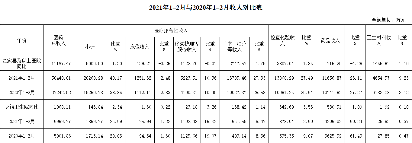 1.医药收入:2月份12家总医院医药总收入22541.32万元,比去年同期15958.09万元,增加6583.23万元,增长41.25%。其中:医疗服务性收入9042.94万元,占医药收入40.12%(床位收入519.51万元、手术治疗护理等服务收入8523.42万元),比去年同期6014.62万元, 医疗服务性收入增加3028.32万元,增长50.35%;药品收入5215.97万元,比去年同期4581.58万元,增加634.39万元,增长13.85%。