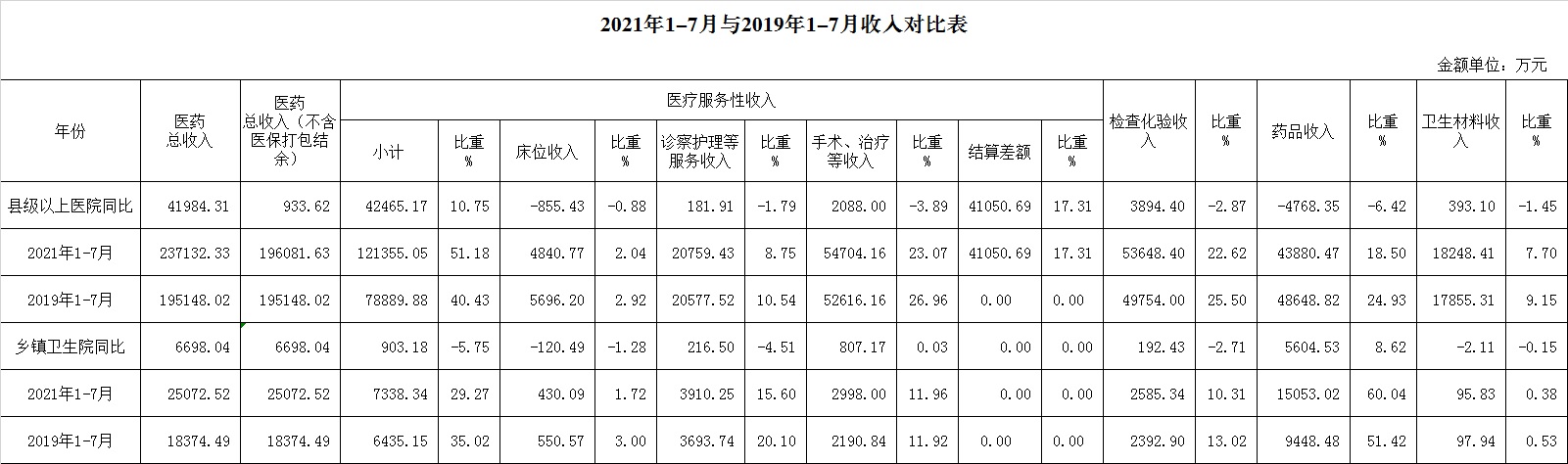 1.医药收入:7月份12家总医院医药总收入38327.76万元,比去年同期26894.24万元,增加11433.51万元,增长42.51%(比2019年同期28302.46万元增加10025.3万元,增长35.42%)。其中:医疗服务性收入20722.69万元,占医药收入54.07%(床位收入725.59万元、手术治疗护理等服务收入11986.67万元、结算差额8010.44万元),比去年同期10846.92万元, 医疗服务性收入增加9875.77万元,增长91.05%;药品收入6532.22万元,比去年同期6272.43万元,增加259.79万元,增长4.14%。