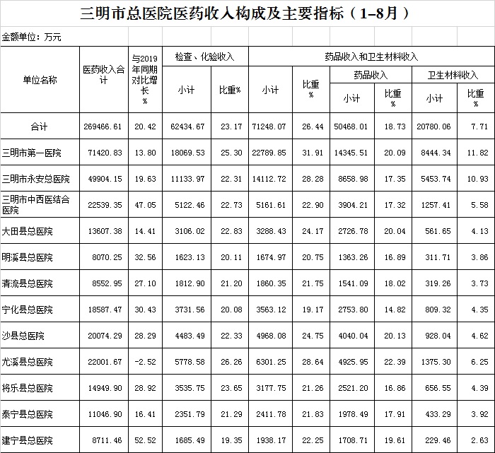 医药总收入。1-8月份12家总医院医药总收入与2019年同比增长37.57%(不含体检收入的医药收入同比增长37.18%),不含医保打包结余的医药总收入与2019年同比增长1.48%,增长率超过考核要求(三级医院考核要求为10%,二级医院考核要求为8%)的有8家总医院,其中市中西医结合医院同比增长17.3%、建宁县总医院同比增长10.21%。