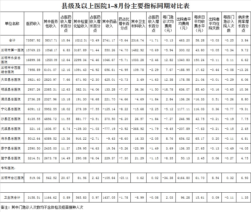 1-8月份基层医疗机构医药总收入28863.02万元(其中村所收入3406.92万元),去年同期25704.51万元,同比增加3158.51万元,增长12.29%,其中:医疗服务性收入8554.74万元,占医药收入29.64%(床位收入521.78万元、手术治疗护理等服务收入8032.96万元),去年同期7390.13万元, 医疗服务性收入同比增加1164.62万元,增长15.76%;检查化验收入2896.63万元,同比增长24.28%;药品收入17302.91万元,去年同期15865.85万元,同比增加1437.05万元,增长9.06%,药占比59.95%,去年同期61.72%,同比下降1.78个百分点;卫生材料收入108.74万元,较去年同期117.73万元,同比减少8.99万元,占医药收入0.38%,较去年同期0.46%,同比下降0.08个百分点。入院人次53924人次,去年同期53127人次,同比增加797人次,增长1.50%,其中三元区、明溪县、大田县分别下降28.09%、25.64%、13.9%;门急诊人次3533532人次(其中村所门急诊1307392人次),去年同期3246578人次,同比增加286954人次,增长8.84%(基层诊疗量占比为43.78%,较去年同期的45.21%降低1.43个百分点);每门诊次均费用68.00元,去年同期65.97元,同比增加2.03元,增长3.07%;出院者平均费用901.44元,去年同期805.16元,同比增加96.28元,增长11.96%。