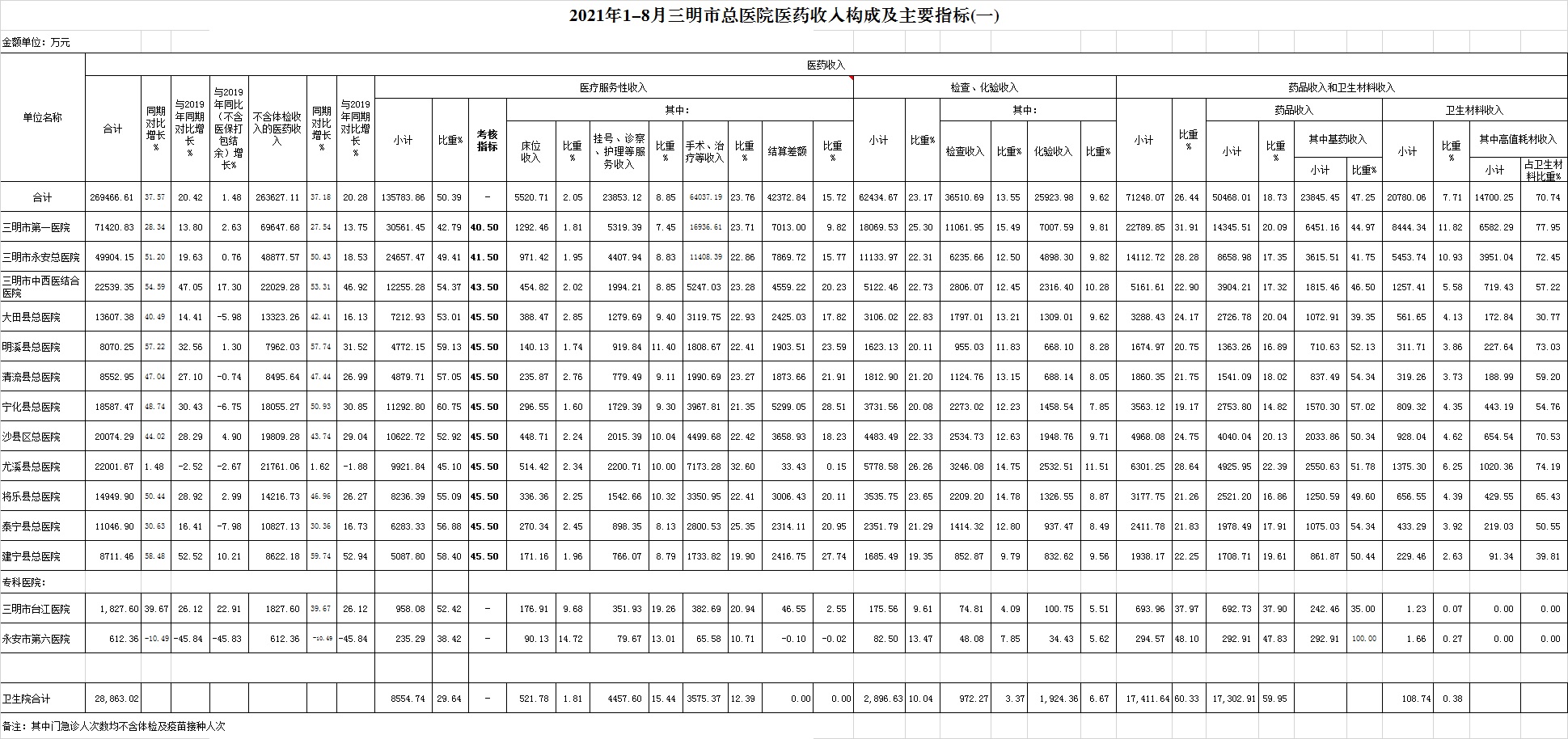 (一)1-8月份12家总医院运行情况:医药总收入269466.61万元,比去年同期195878.69万元增加73587.92万元,增长37.57%(比2019年同期223781.47万元增加45685.14万元,增长20.42%);不含医保打包结余医药收入为227093.77万元,比2019年同期223781.47万元增加3312.3万元,增长1.48%;不含体检收入的医药收入为263627.11万元,比去年同期增加71457.03万元,增长37.18%。其中:医疗服务性收入135783.86万元,占医药收入50.39%(床位收入5520.71万元、手术治疗护理等服务收入87890.31万元、结算差额42372.84万元),比去年同期77466.15万元,医疗服务性收入增加58317.71万元,增长75.28%;检查化验收入62434.67万元,占医药收入23.17%,同比增长19.56%;药品收入50468.01万元,药占比18.73%,分别比去年同期增长5.74%、下降5.64个百分点;卫生材料收入20780.06万元(其中高值耗材收入14700.25万元),占医药总收入7.71%,比去年同期9.43%,下降1.71个百分点。入院人次193724人次,比去年同期177828人次,增加15896人次,增长8.94%;门急诊人次4537495人次,比去年同期3934773人次,增加602722人次,增长15.32%;每门诊次均费用195.35元,比去年同期195.48元,减少0.13元,下降0.07%;出院者平均费用6837.28元,比去年同期6374.07元,增加463.20元,增长7.27%。