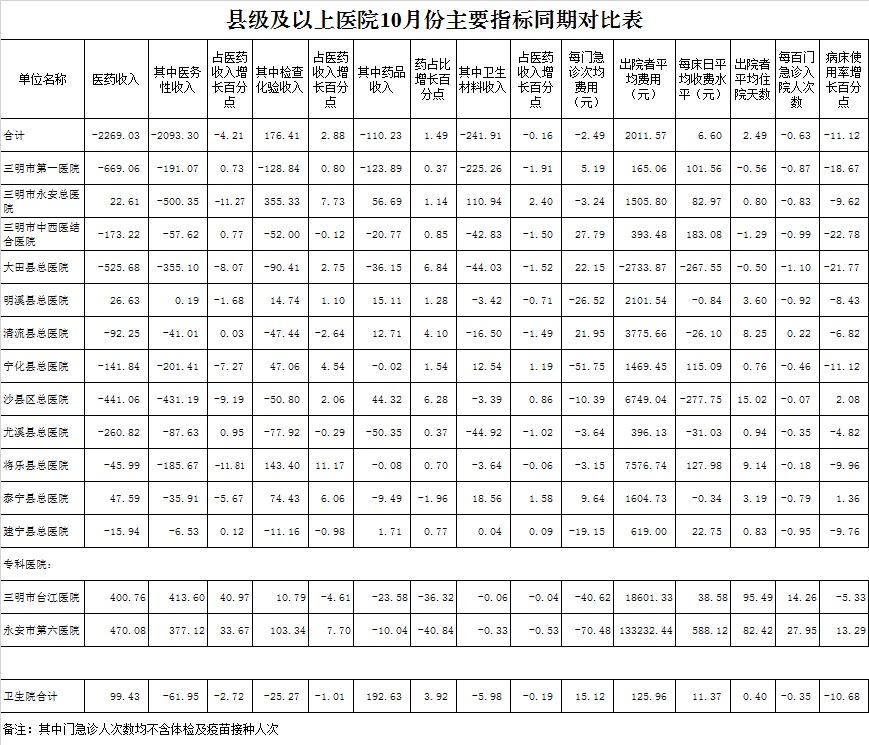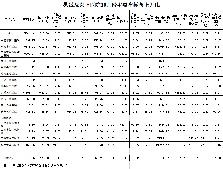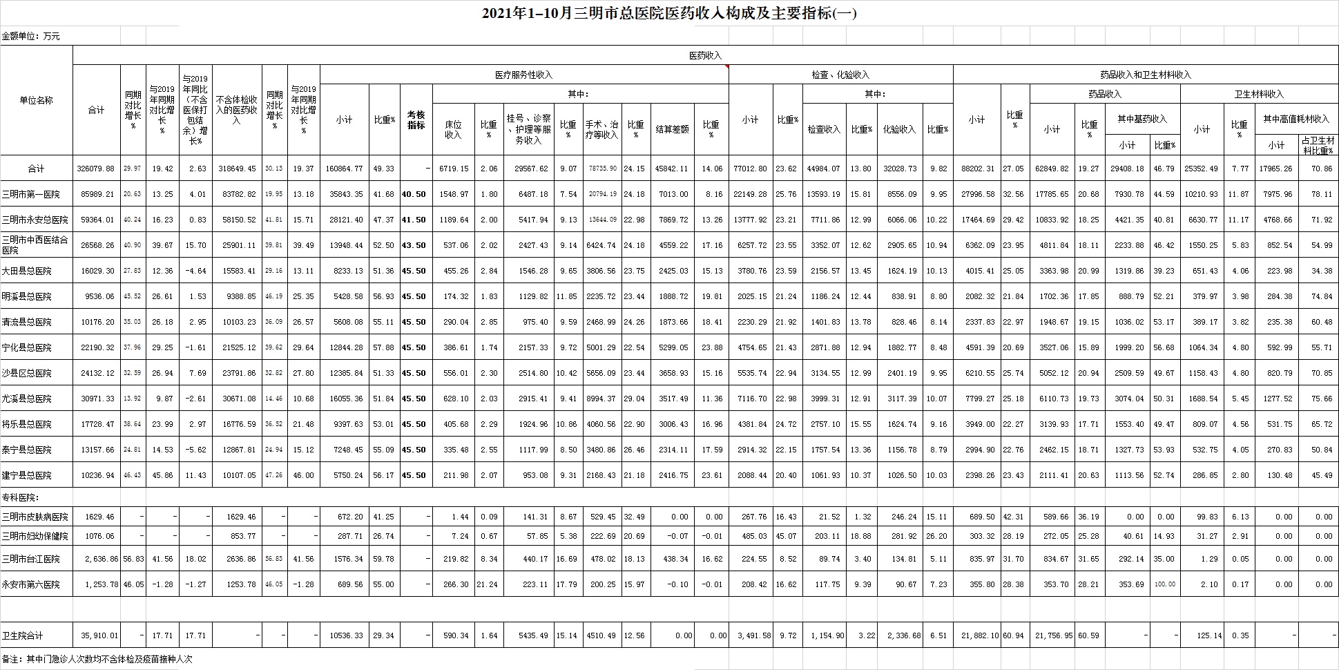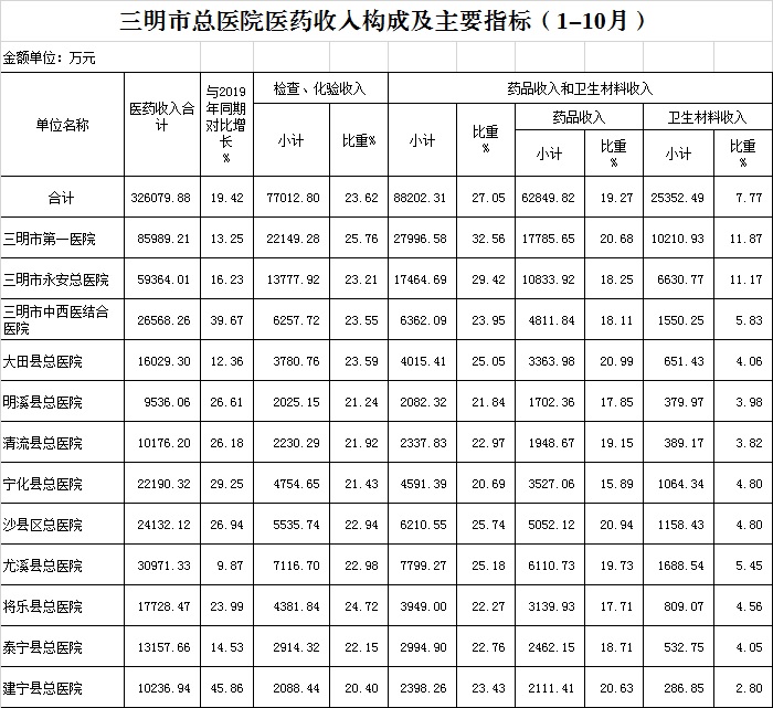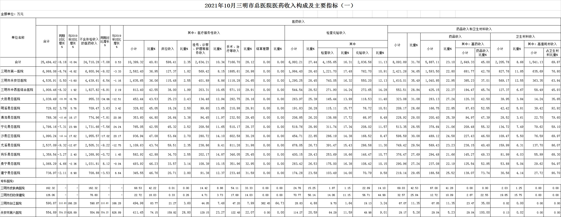 医药总收入。1-10月份12家总医院医药总收入与2019年同比增长19.42%(不含体检收入的医药收入同比增长19.37%),不含医保打包结余的医药总收入与2019年同比增长2.63%,增长率超过考核要求(三级医院考核要求为10%,二级医院考核要求为8%)的有2家总医院,其中市中西医结合医院同比增长15.70%、建宁县总医院同比增长11.43%.