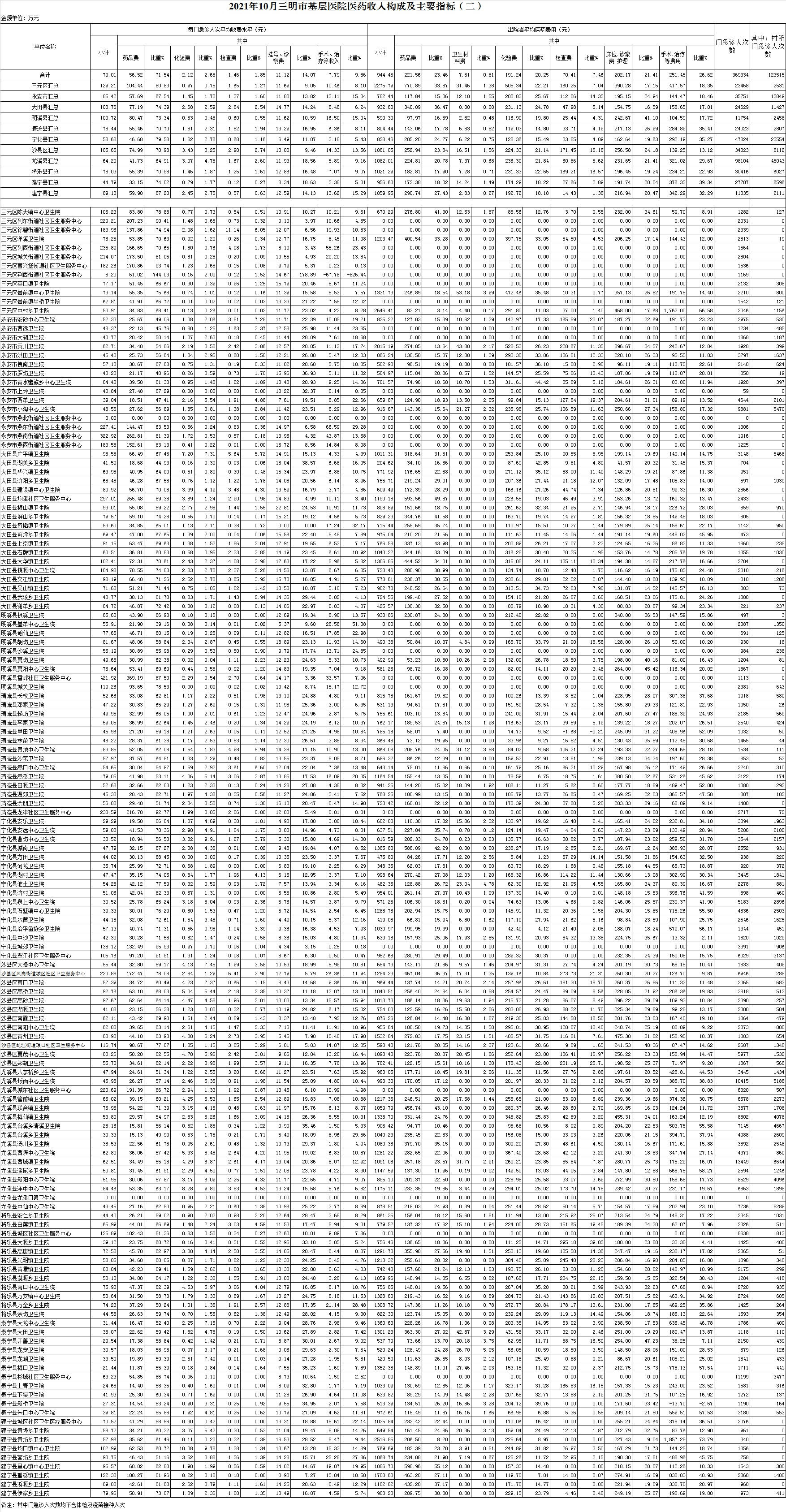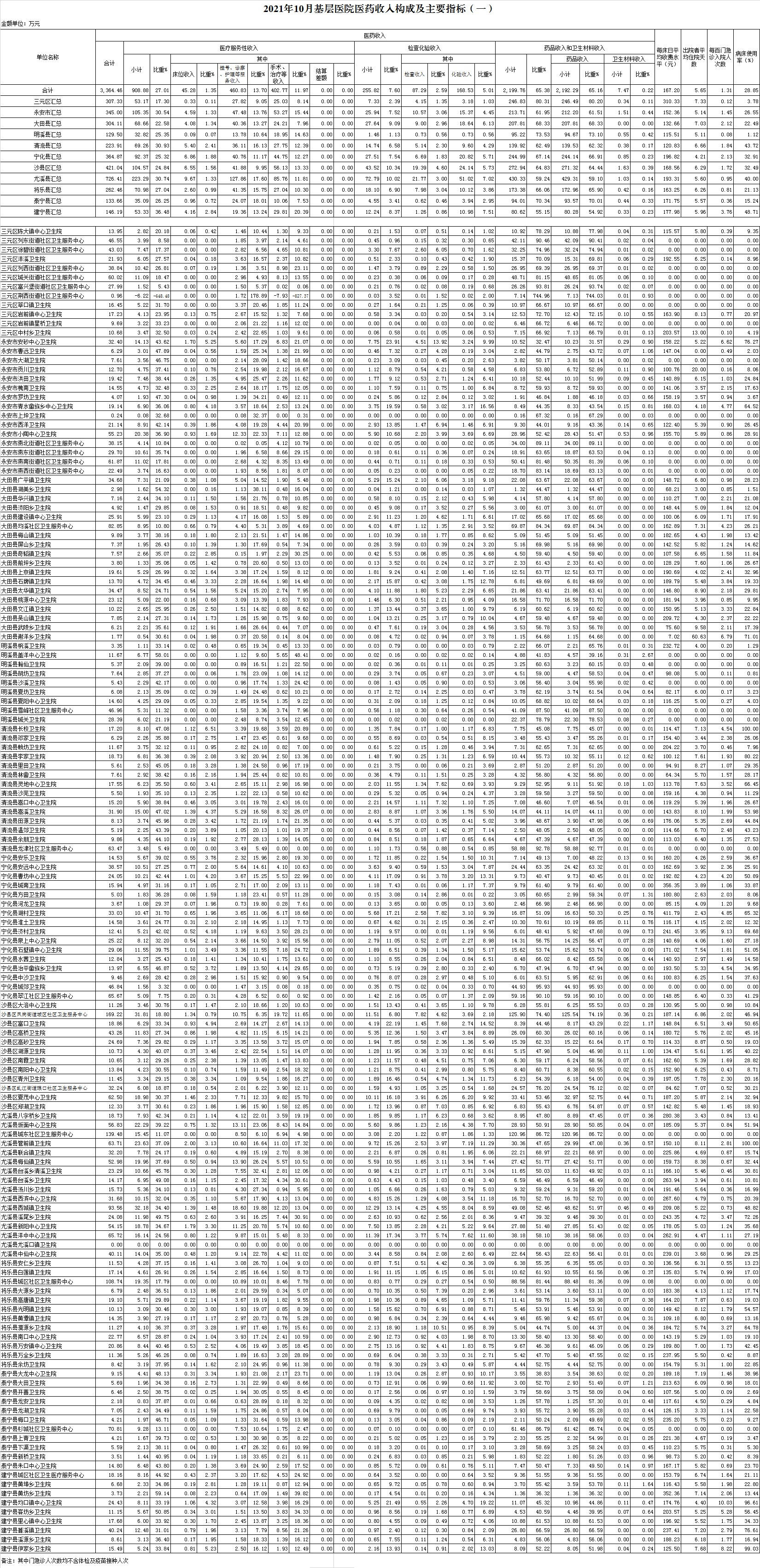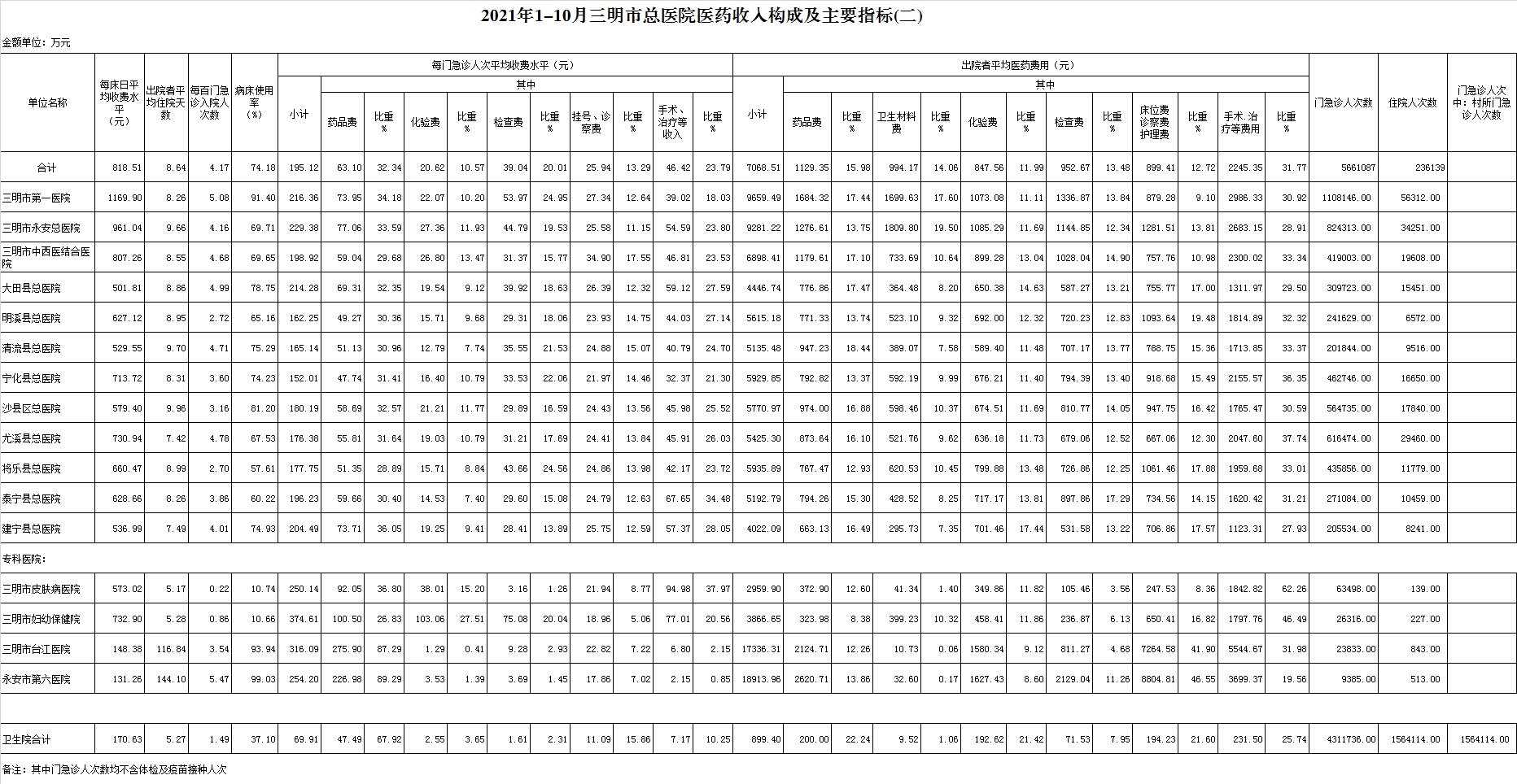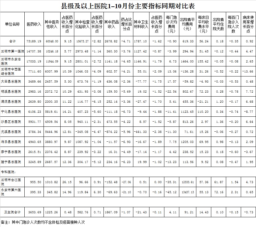 1-10月份基层医疗机构医药总收入35910.01万元(其中村所收入4123.44万元),去年同期32256.32万元,同比增加3653.69万元,增长11.33%,其中:医疗服务性收入10536.33万元,占医药收入29.34%(床位收入590.34万元、手术治疗护理等服务收入9945.98万元),去年同期9311.06万元, 医疗服务性收入同比增加1225.26万元,增长13.16%;检查化验收入3491.58万元,同比增长20.03%;药品收入21756.95万元,去年同期19889.86万元,同比增加1867.09万元,增长9.39%,药占比60.59%,去年同期61.66%,同比下降1.07个百分点;卫生材料收入125.14万元,较去年同期146.57万元,同比减少21.43万元,占医药收入0.35%,较去年同期0.45%,同比下降0.11个百分点。入院人次64402人次,去年同期66986人次,同比减少2584人次,下降3.86%,其中明溪县、三元区、大田县分别下降37.57%、36.27%、18.51%;门急诊人次4311736人次(其中村所门急诊1564114人次),去年同期4078229人次,同比增加233507人次,增长5.73%(基层诊疗量占比为43.23%,较去年同期的44.91%下降1.68个百分点);每门诊次均费用69.91元,去年同期65.80元,同比增加4.11元,增长6.24%;出院者平均费用899.40元,去年同期808.18元,同比增加91.22元,增长11.29%。