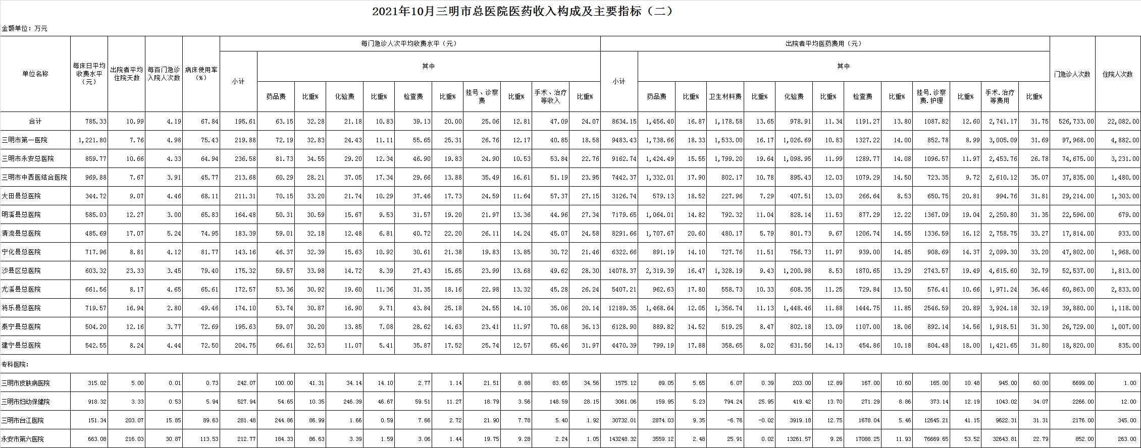 医疗服务性收入占比。1-10月份12家总医院医疗服务性收入占医药总收入49.33%,其中:市第一医院41.68%、三明市永安总医院47.37%、市中西医结合医院52.50%、大田县总医院51.36%、明溪县总医院56.93%、清流县总医院55.11%、宁化县总医院57.88%、沙县总医院51.33%、尤溪县总医院51.84%、将乐县总医院53.01%、泰宁县总医院55.09%、建宁县总医院56.17%,所有总医院全部完成考核指标。