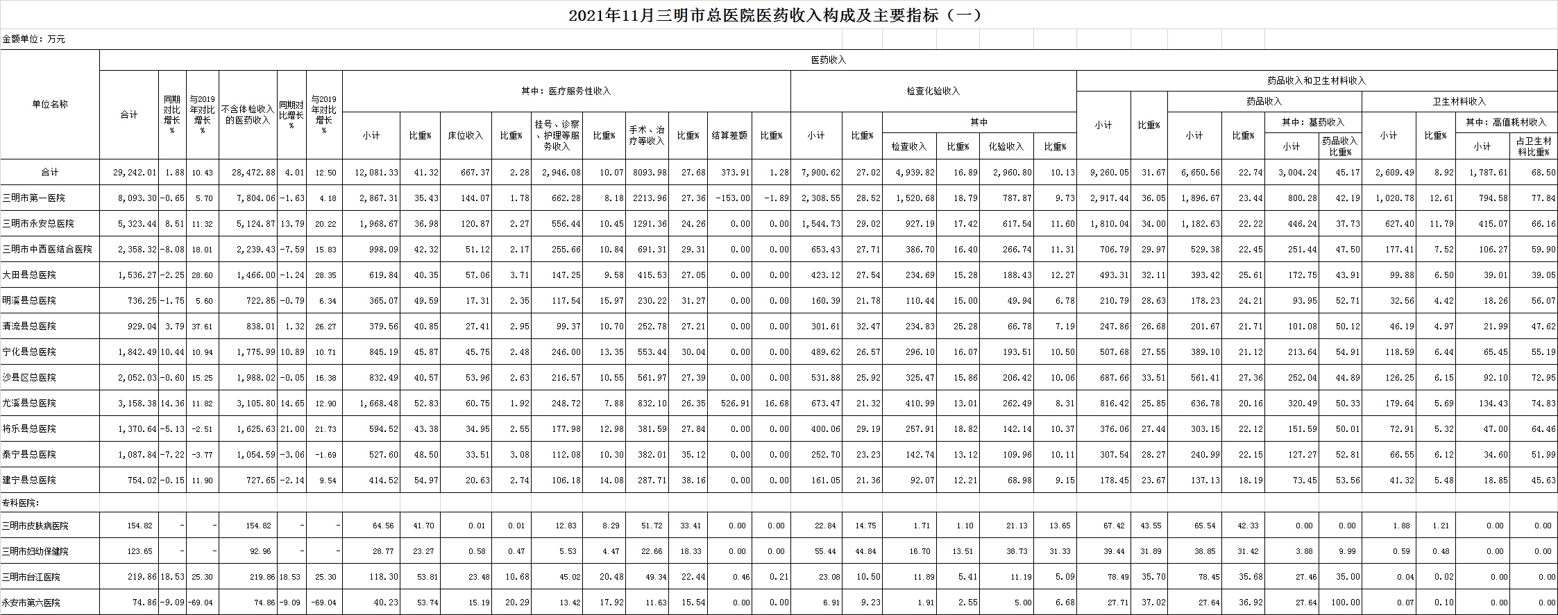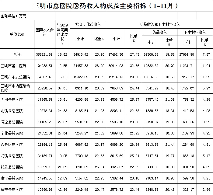 医药总收入。1-11月份12家总医院医药总收入与2019年同比增长18.62%(不含体检收入的医药收入同比增长18.78%),不含医保打包结余的医药总收入与2019年同比增长3.19%,增长率超过考核要求(三级医院考核要求为10%,二级医院考核要求为8%)的有2家总医院,其中市中西医结合医院同比增长15.92%、建宁县总医院同比增长11.47%.
