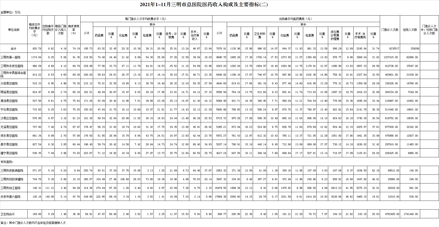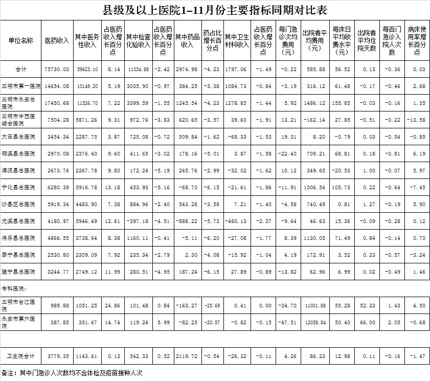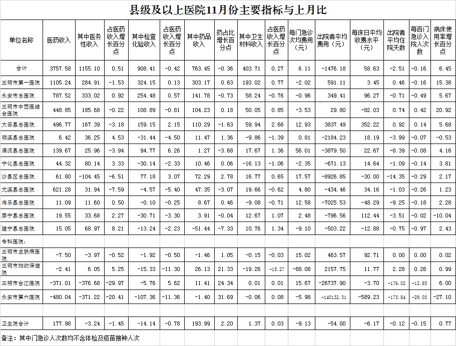 1-11月份基层医疗机构医药总收入39452.45万元(其中村所收入4582.73万元),去年同期35673.10万元,同比增加3779.35万元,增长10.59%,其中:医疗服务性收入11441.96万元,占医药收入29.00%(床位收入638.70万元、手术治疗护理等服务收入10803.26万元),去年同期10298.35万元, 医疗服务性收入同比增加1143.61万元,增长11.10%;检查化验收入3733.26万元,同比增长17.00%;药品收入24143.24万元,去年同期22023.51万元,同比增加2119.72万元,增长9.62%,药占比61.20%,去年同期61.74%,同比下降0.54个百分点;卫生材料收入133.99万元,较去年同期160.30万元,同比减少26.32万元,占医药收入0.34%,较去年同期0.45%,同比下降0.11个百分点。入院人次69522人次,去年同期73584人次,同比减少4062人次,下降5.52%,其中明溪县、三元区、大田县分别下降38.47%、37.08%、19.6%;门急诊人次4752405人次(其中村所门急诊1741440人次),去年同期4522446人次,同比增加229959人次,增长5.08%(基层诊疗量占比为43.25%,较去年同期的44.84%下降1.59个百分点);每门诊次均费用69.91元,去年同期65.64元,同比增加4.26元,增长6.49%;出院者平均费用898.77元,去年同期812.54元,同比增加86.23元,增长10.61%。