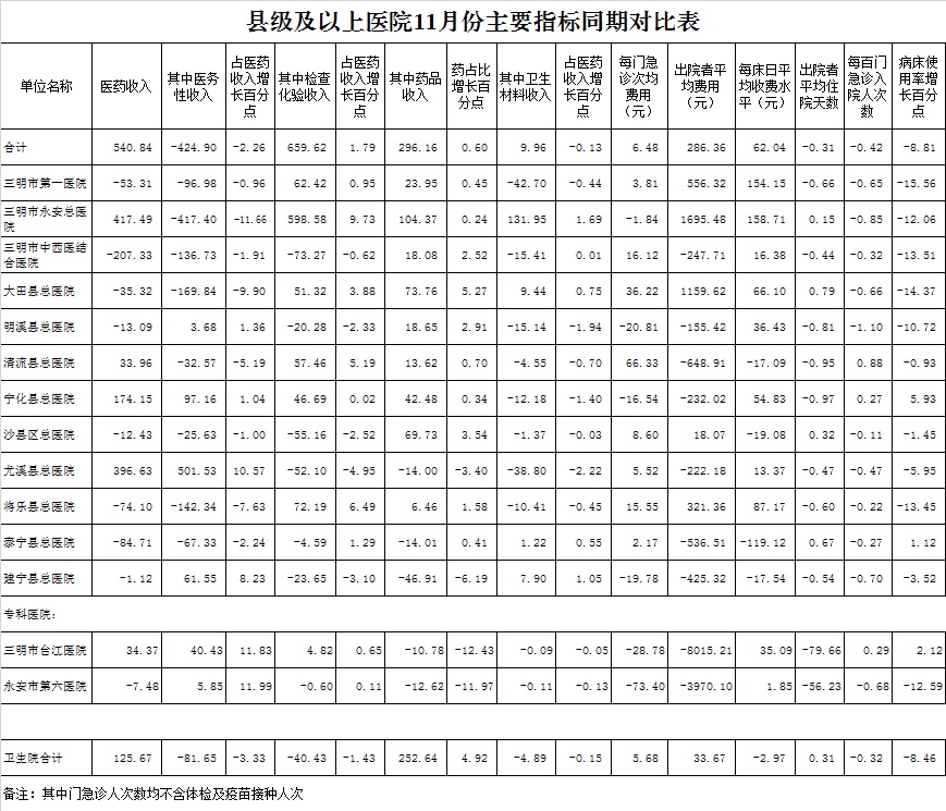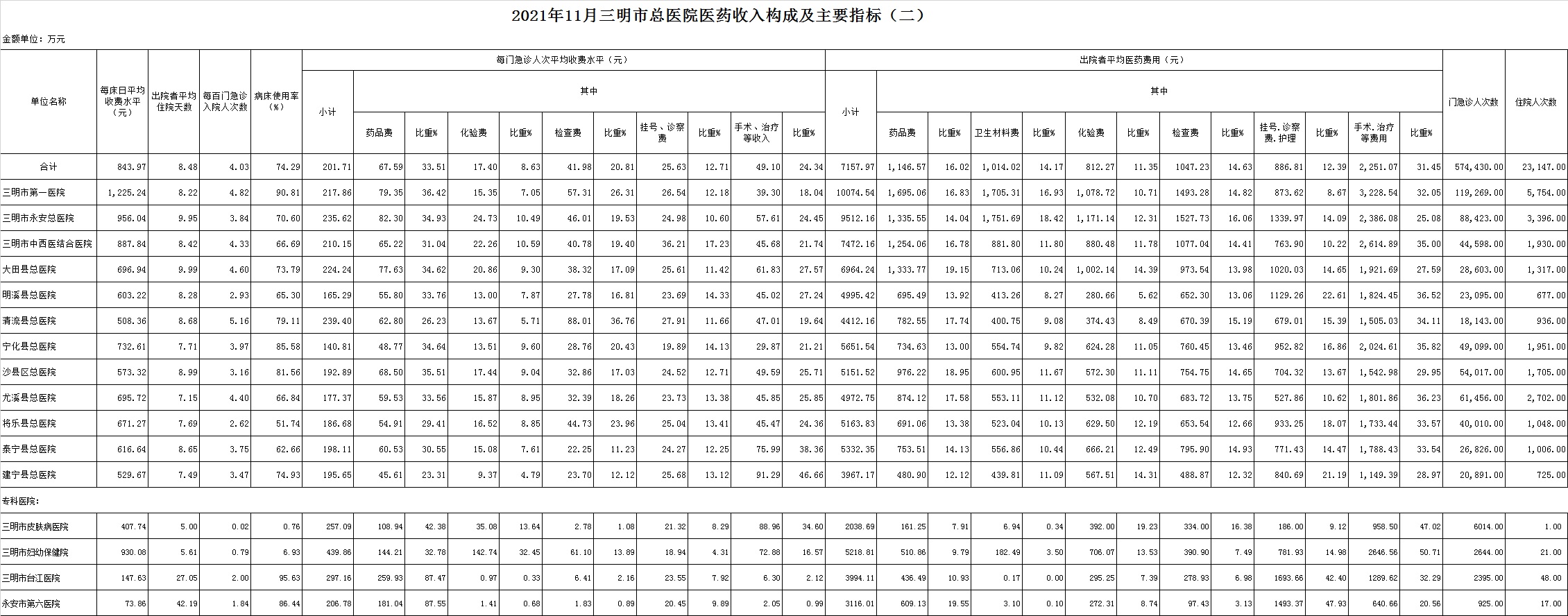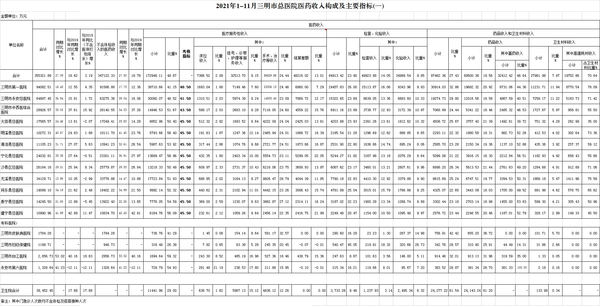 医疗服务性收入占比。1-11月份12家总医院医疗服务性收入占医药总收入48.67%,其中:市第一医院41.15%、三明市永安总医院46.52%、市中西医结合医院51.67%、大田县总医院50.40%、明溪县总医院56.40%、清流县总医院53.92%、宁化县总医院56.96%、沙县总医院50.48%、尤溪县总医院51.93%、将乐县总医院52.32%、泰宁县总医院54.59%、建宁县总医院56.09%,所有总医院全部完成考核指标。