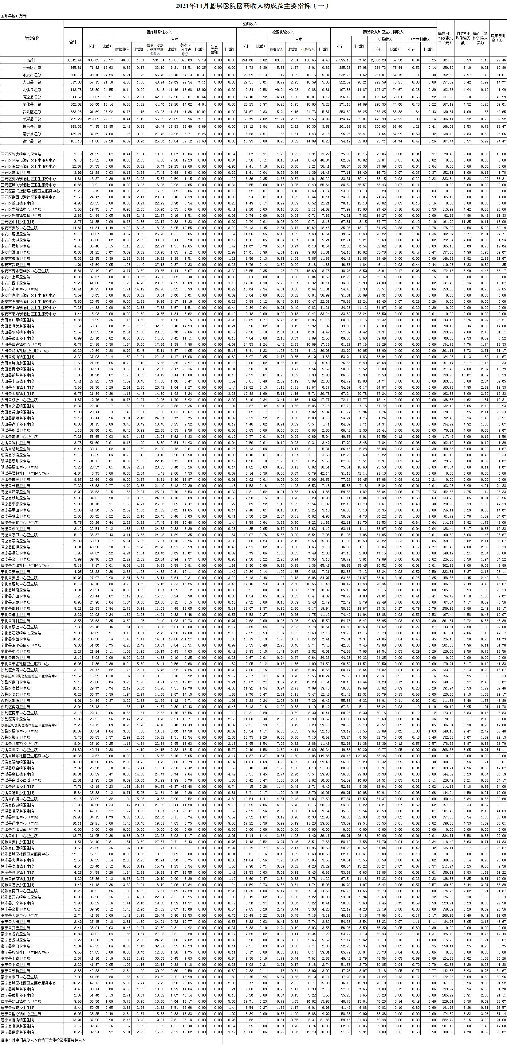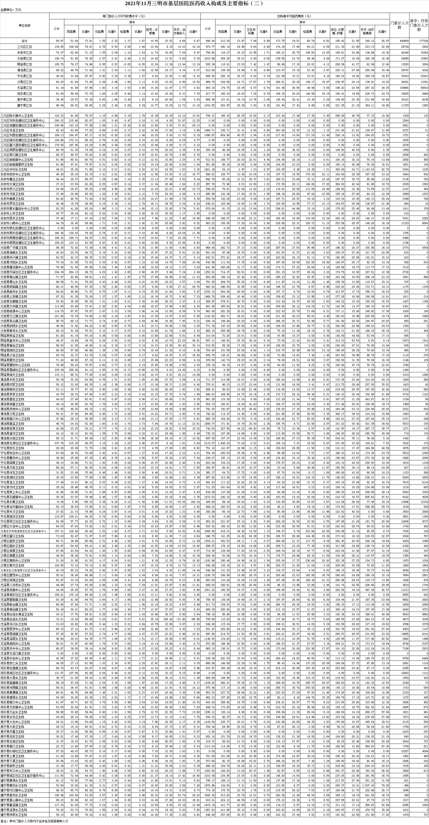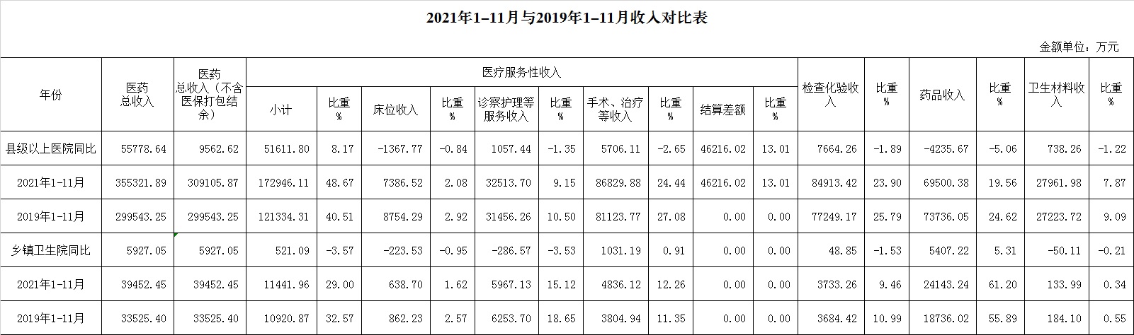 1.医药收入:11月份12家总医院医药总收入29242.01万元,比去年同期28701.17万元,增加540.84万元,增长1.88%(比2019年同期26480.82万元增加2761.19万元,增长10.43%)。其中:医疗服务性收入12081.33万元,占医药收入41.32%(床位收入667.37万元、手术治疗护理等服务收入11040.06万元),比去年同期12506.23万元, 医疗服务性收入减少424.90万元,下降3.40%;药品收入6650.56万元,比去年同期6354.40万元,增加296.16万元,增长4.66%。