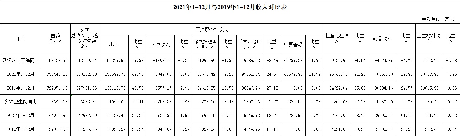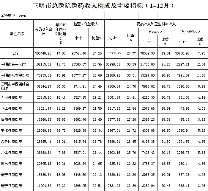 (一)1-12月份12家总医院运行情况:医药总收入386440.28万元,比去年同期314561.92万元增加71878.36万元,增长22.85%(比2019年同期327951.96万元增加58488.32万元,增长17.83%);不含医保打包结余医药收入为340102.40万元,比2019年同期327951.96万元增加12150.44万元,增长3.70%;不含体检收入的医药收入为377031.45万元,比去年同期增加71096.24万元,增长23.24%。其中:医疗服务性收入185397.35万元,占医药收入47.98%(床位收入8049.01万元、手术治疗护理等服务收入131010.46万元,结算差额46337.88万元),比去年同期130414.76万元,医疗服务性收入增加54982.59万元,增长42.16%;检查化验收入93744.70万元,占医药收入24.26%,同比增长14.49%;药品收入76559.30万元,药占比19.81%,分别比去年同期增长4.69%、下降3.44个百分点;卫生材料收入30738.93万元(其中高值耗材收入21832.14万元),占医药总收入7.95%,比去年同期9.26%,下降1.31个百分点。入院人次282049人次,比去年同期275022人次,增加7027人次,增长2.56%;门急诊人次7216149人次,比去年同期6168804人次,增加1047345人次,增长16.98%;每门诊次均费用187.30元,比去年同期195.70元,减少8.40元,下降4.29%;出院者平均费用7183.37元,比去年同期6936.54元,增加246.83元,增长3.56%。