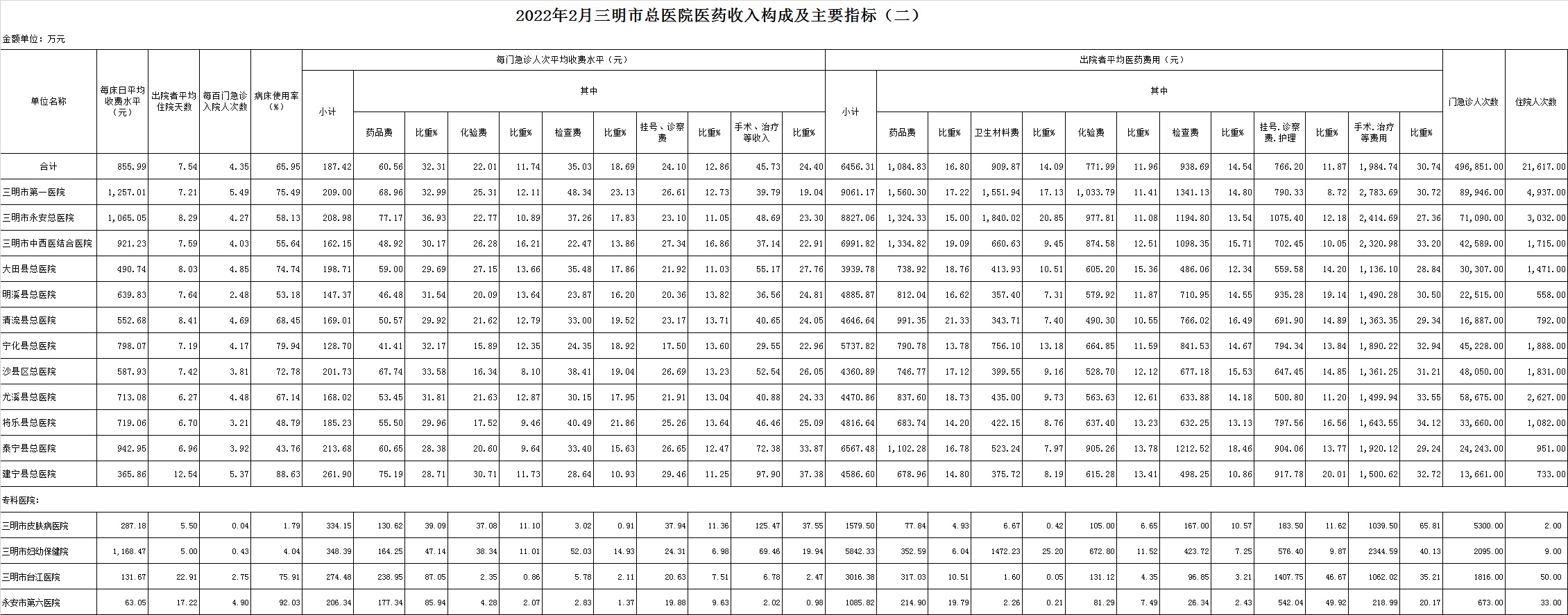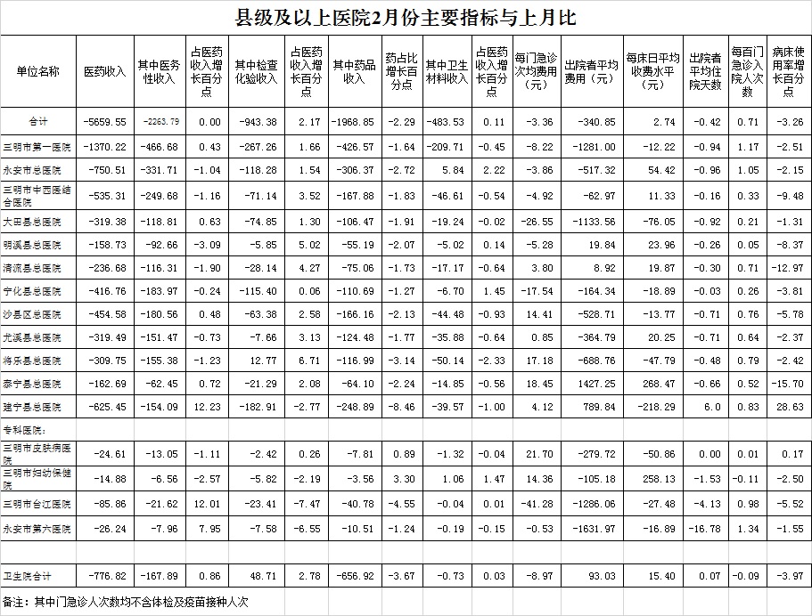 2022年2月三明市公立医疗机构运行情况