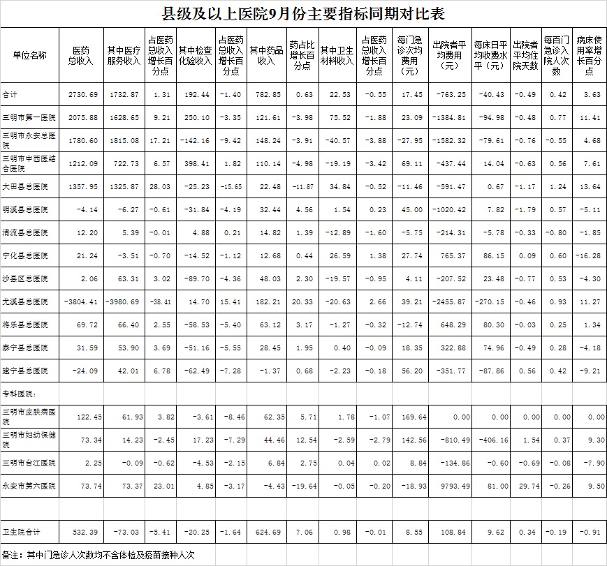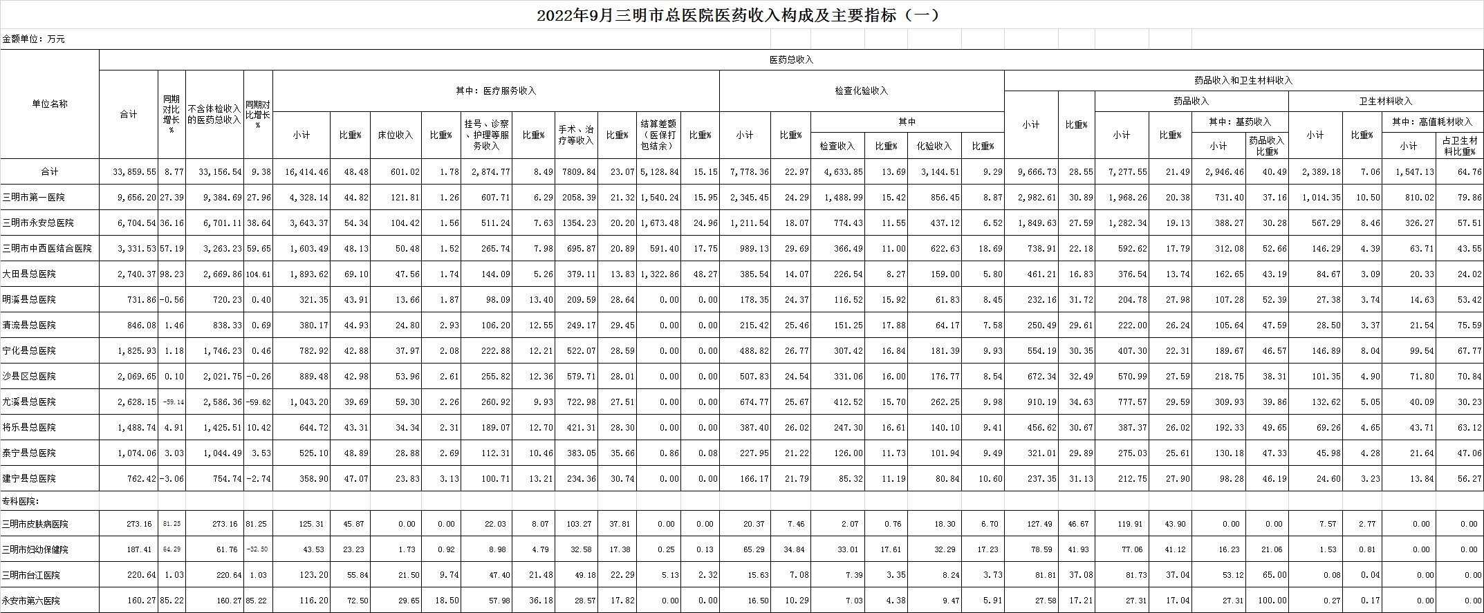 医药总收入。1-9月份12家总医院医药总收入同比下降0.26%(不含体检收入的医药收入同比增长0.29%),增长率超过考核要求(三级医院考核要求为12%,二级医院考核要求为10%)的有1家总医院,其中大田县总医院同比增长18.64%。