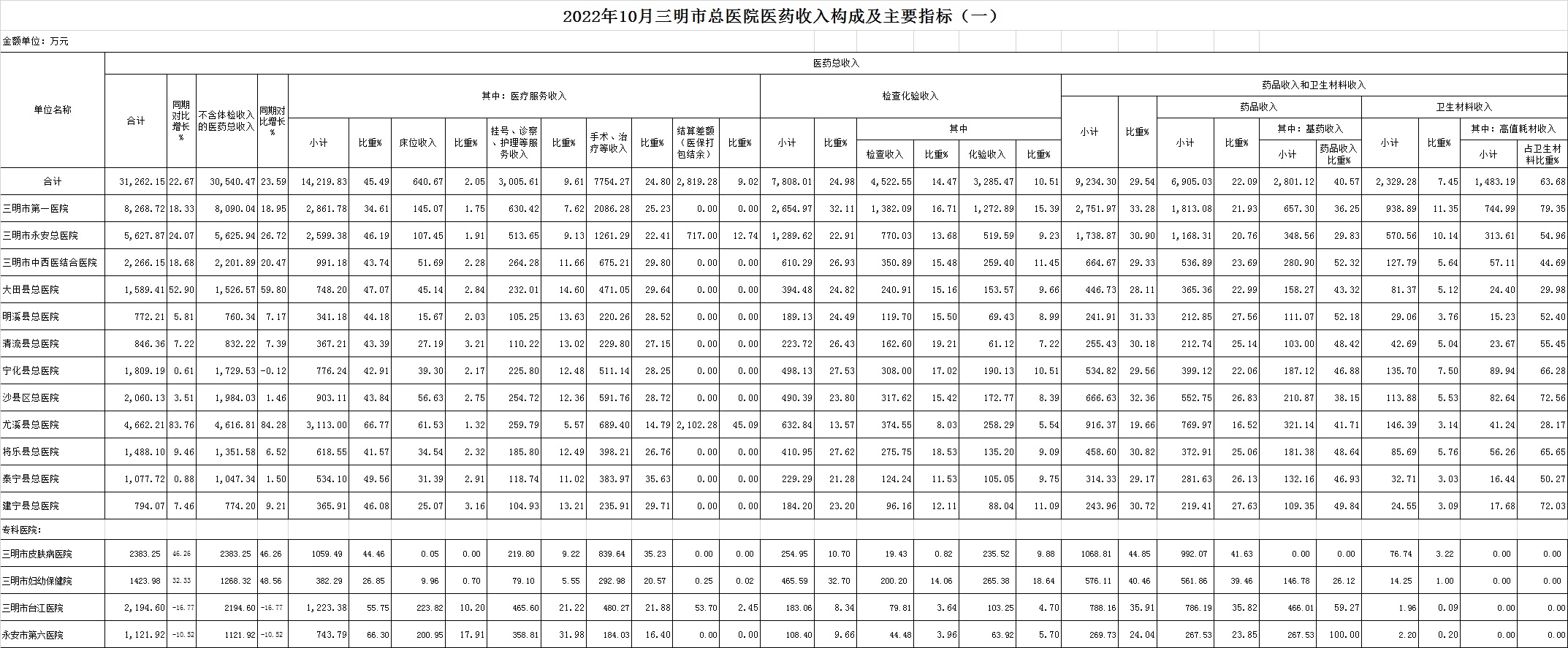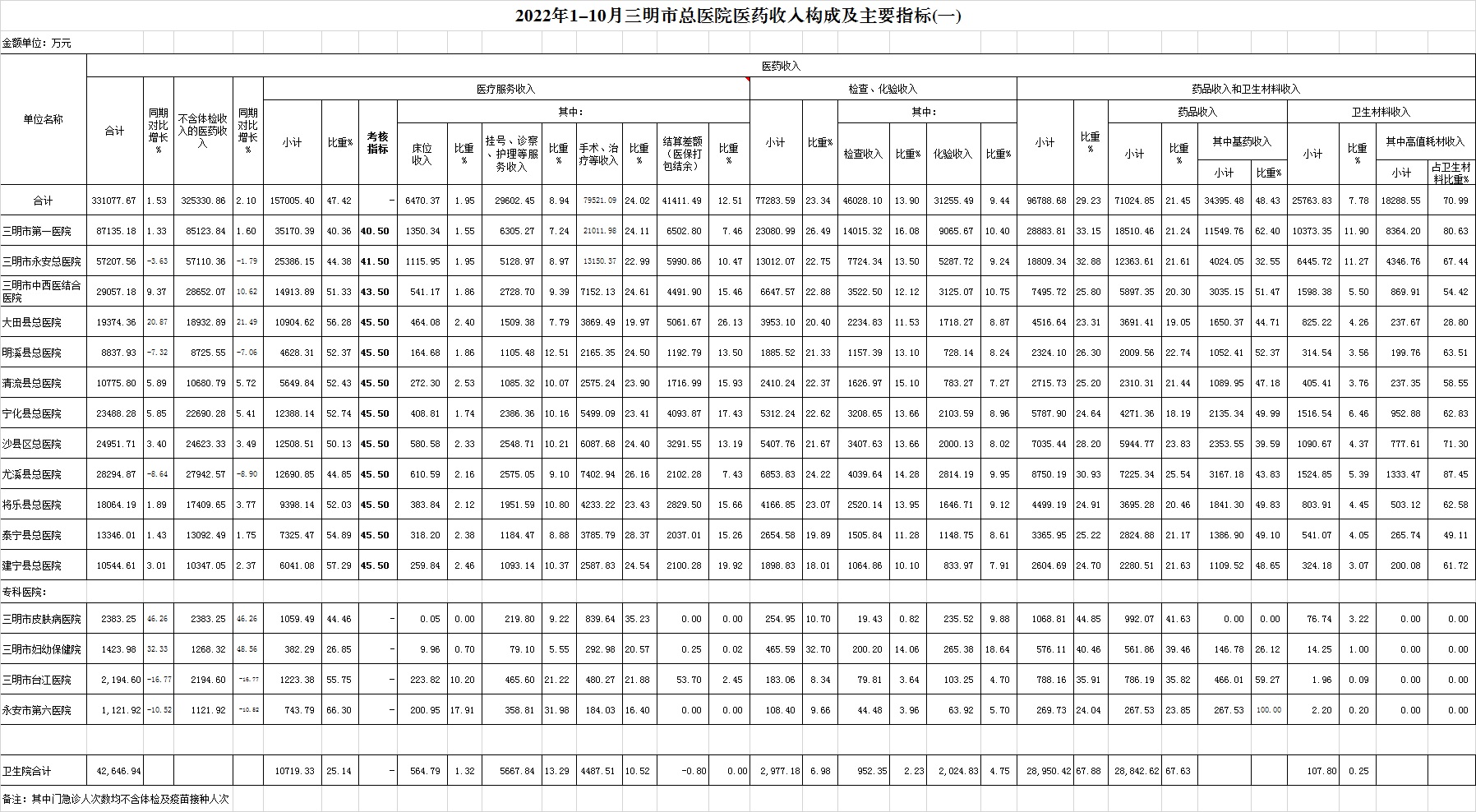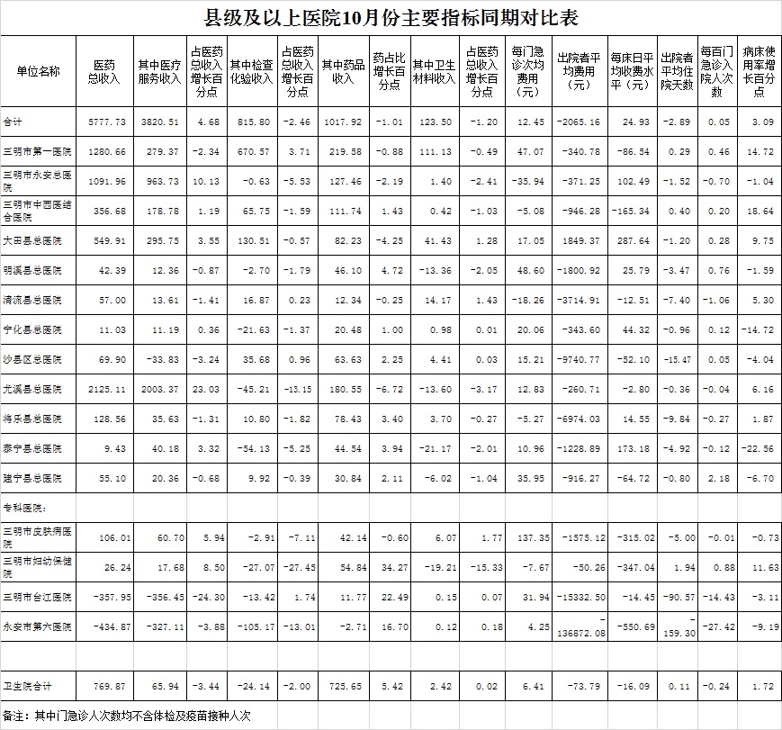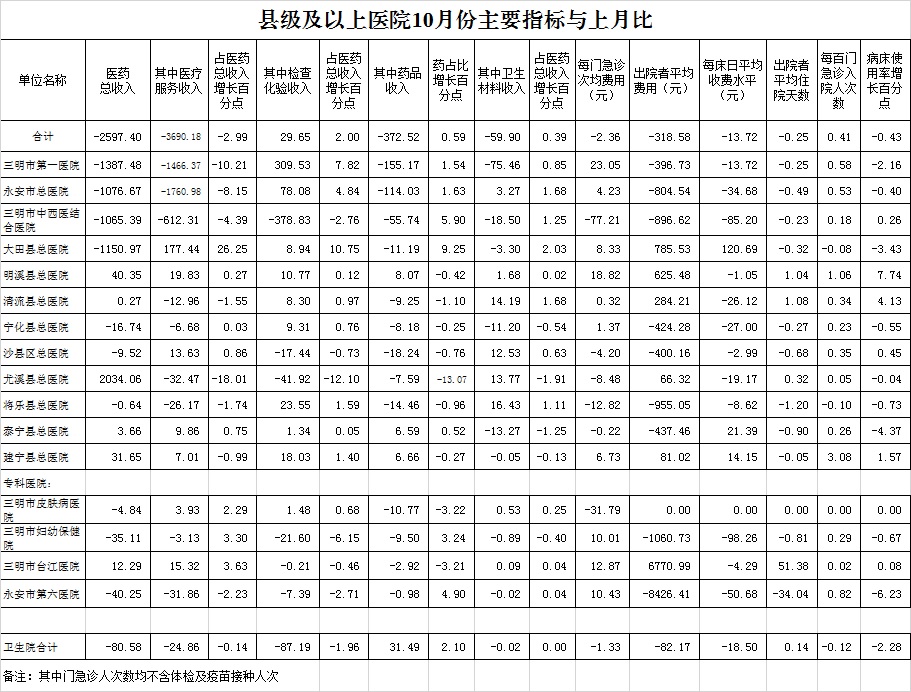 2022年10月三明市公立医疗机构运行情况