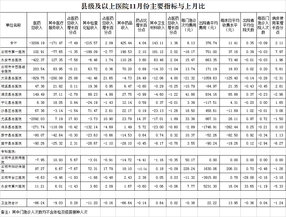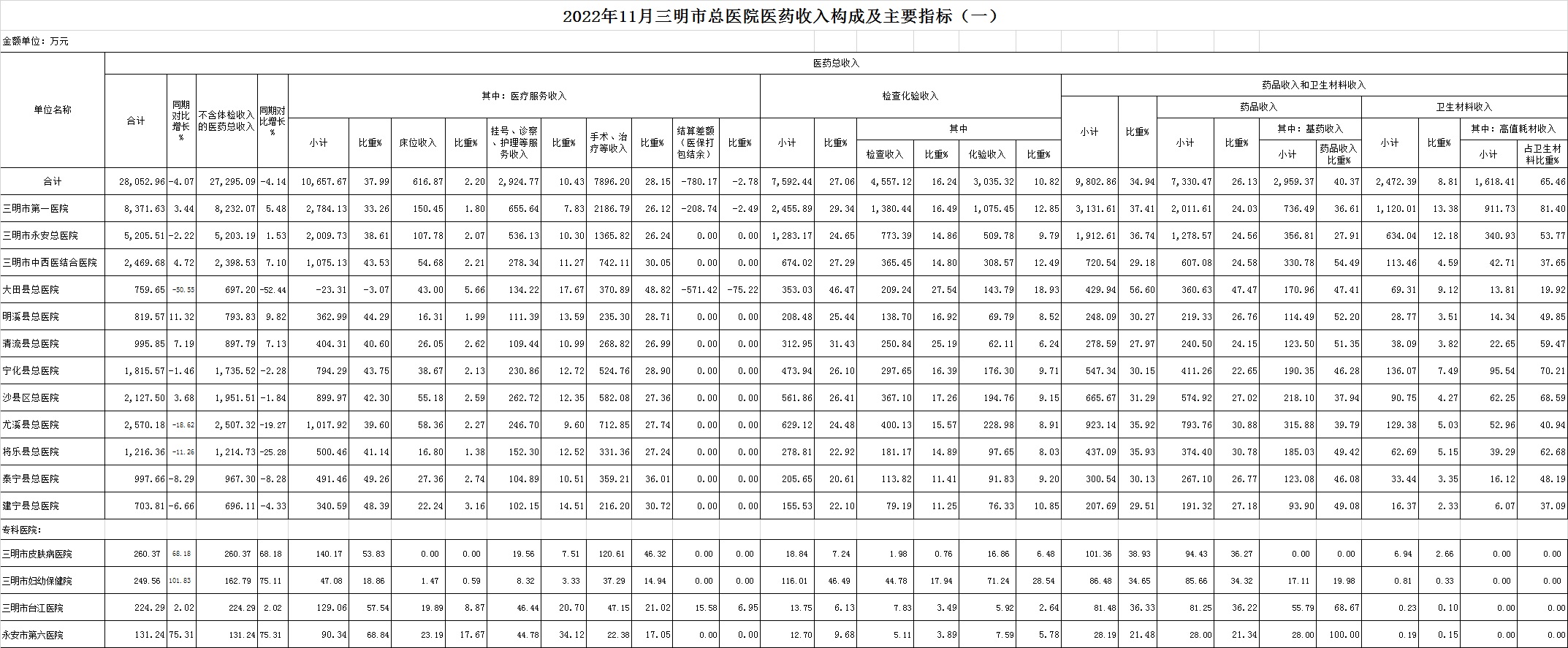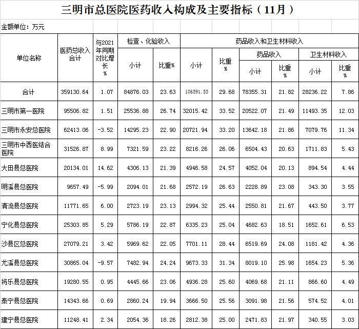医药总收入。1-11月份12家总医院医药总收入同比增长1.07%(不含体检收入的医药收入同比增长1.59%),增长率超过考核要求(三级医院考核要求为10%,二级医院考核要求为8%)的有1家总医院,其中大田县总医院同比增长14.62%。