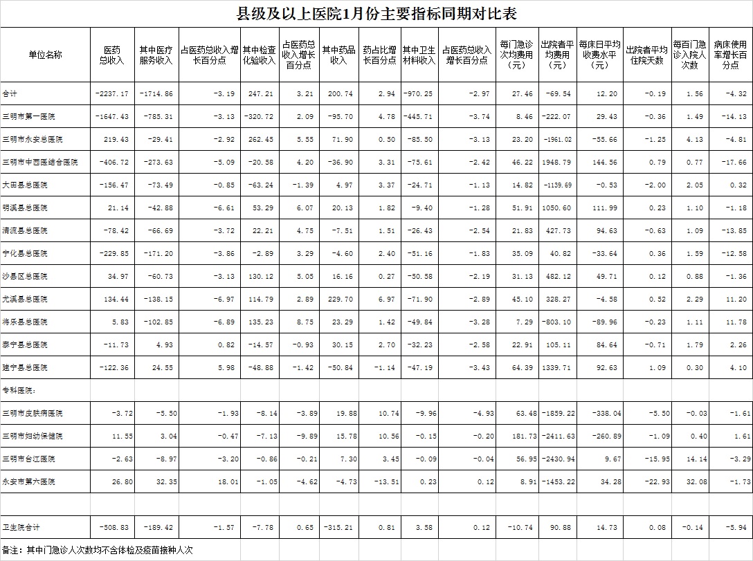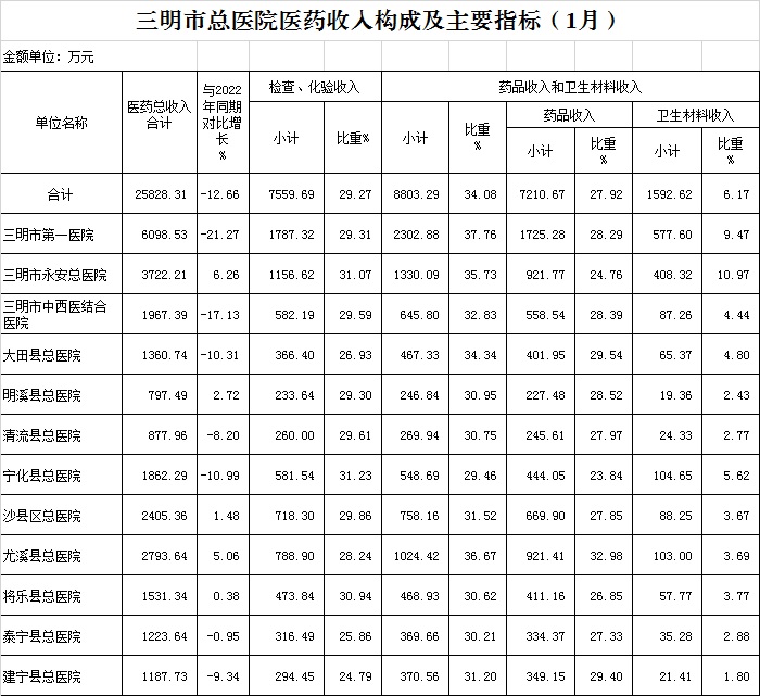 2023年1月三明市公立医疗机构运行情况