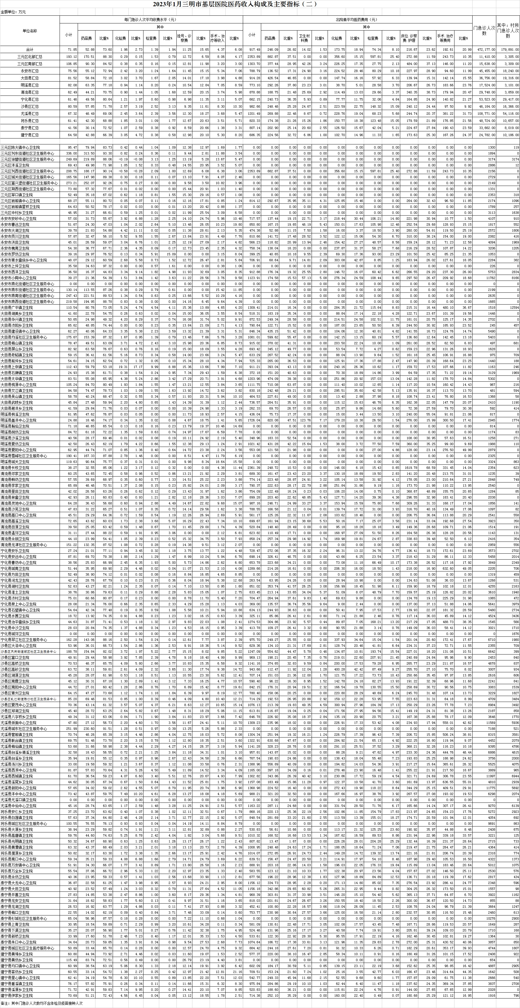 1月份基层医疗机构医药总收入3785.75万元(其中村所收入508.41万元),去年同期4294.58万元,同比减少508.83万元,下降11.85%,其中:医疗服务性收入906.31万元,占医药收入23.94%(床位收入41.39万元、手术治疗护理等服务收入864.91万元),去年同期1095.73万元, 医疗服务性收入同比减少189.42万元,下降17.29%;检查化验收入264.45万元,同比下降2.86%;药品收入2602.43万元,去年同期2917.64万元,同比减少315.21万元,下降10.80%,药占比68.74%,去年同期67.94%,同比增长0.81个百分点;卫生材料收入12.57万元,较去年同期8.99万元,同比增加3.58万元,占医药收入0.33%,较去年同期0.21%,同比增长0.12个百分点。入院人次4539人次,去年同期5124人次,同比减少585人次,下降11.42%,其中三元区南部、宁化县、明溪县分别下降80%、65.91%、41.45%;门急诊人次472177人次(其中村所门急诊179891人次),去年同期466354人次,同比增加5823人次,增长1.25%(基层诊疗量占比为52.24%,较去年同期的41.93%增长10.31个百分点);每门诊次均费用71.85元,去年同期82.60元,同比减少10.74元,下降13.01%;出院者平均费用917.49元,去年同期826.61元,同比增加90.88元,增长10.99%。