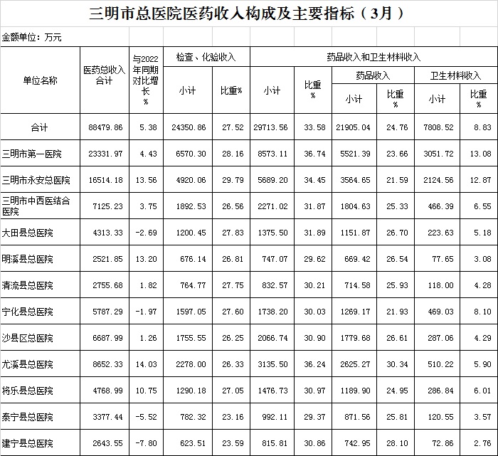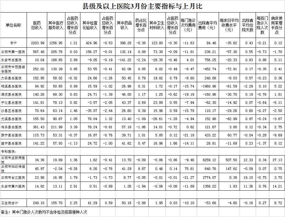 2023年3月三明市公立医疗机构运行情况