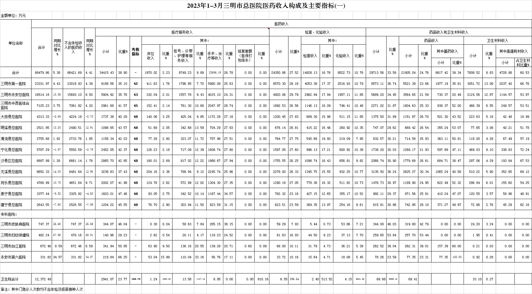 (一)1-3月份12家总医院运行情况:医药总收入88479.86万元,比去年同期83963.96万元增加4515.90万元,增长5.38%(不含体检收入的医药收入为86421.69万元,比去年同期82769.43万元,增加3652.26万元,增长4.41%)。其中:医疗服务性收入34415.43万元,占医药收入38.90%(床位收入1970.02万元、手术治疗护理等服务收入32445.42万元),比去年同期33582.19万元,医疗服务性收入增加833.25万元,增长2.48%;检查化验收入24350.86万元,占医药收入27.52%,同比增长8.31%;药品收入21905.04万元,药占比24.76%,分别比去年同期增长7.75%、增长0.55个百分点;卫生材料收入7808.52万元(其中高值耗材收入4726.88万元),占医药总收入8.83%,比去年同期9.02%,下降0.19个百分点。入院人次73484人次,比去年同期69035人次,增加4449人次,增长6.44%;门急诊人次1505421人次,比去年同期1830488人次,减少325067人次,下降17.76%;每门诊次均费用224.16元,比去年同期186.25元,增加37.91元,增长20.35%;出院者平均费用6951.13元,比去年同期6765.66元,增加185.47元,增长2.74%。