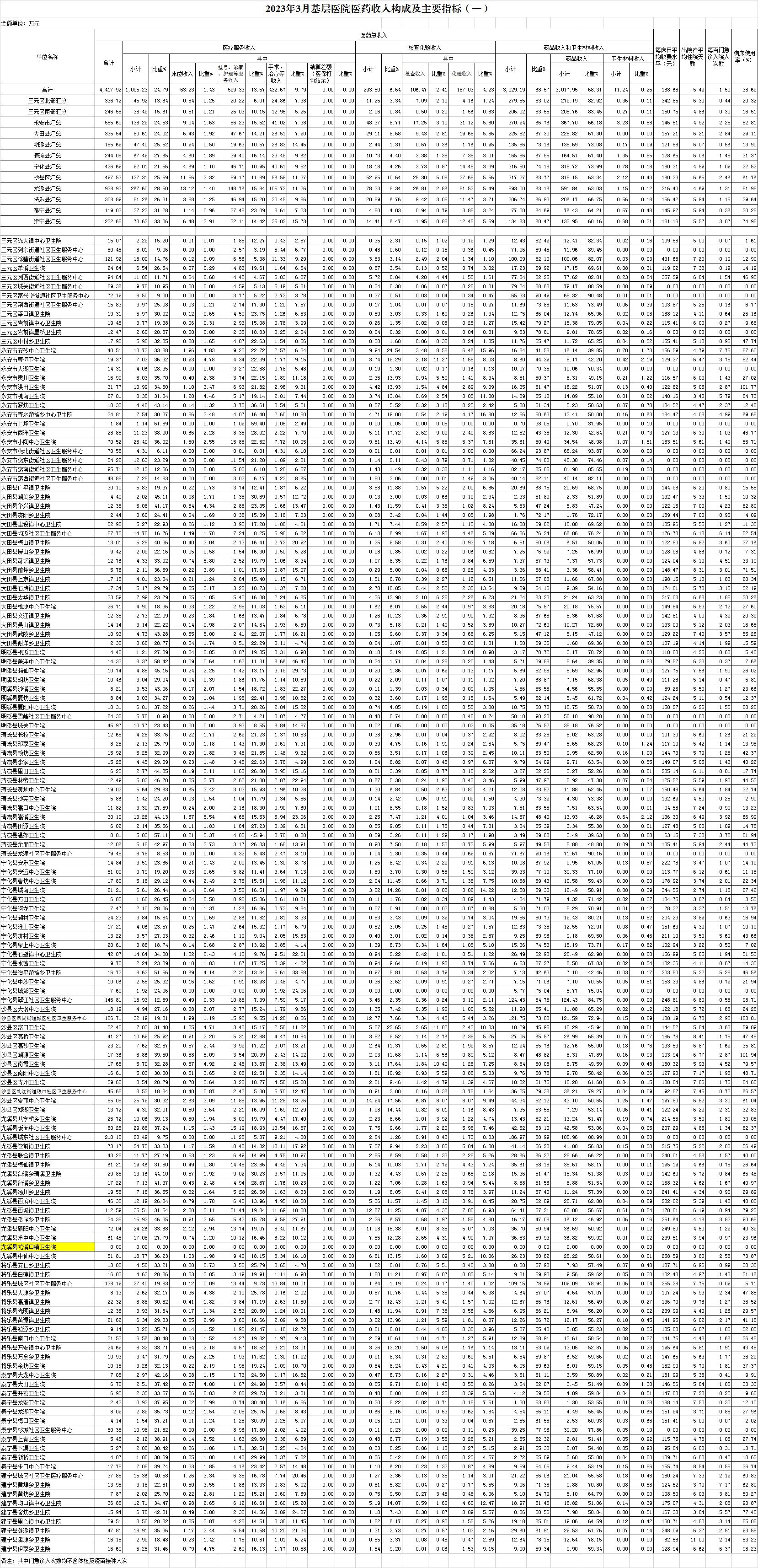 1-3月份基层医疗机构医药总收入12372.49万元(其中村所收入1377.99万元),去年同期11927.37万元,同比增加445.12万元,增长3.73%,其中:医疗服务性收入2941.07万元,占医药收入23.77%(床位收入153.74万元、手术治疗护理等服务收入2787.33万元),去年同期3161.41万元,医疗服务性收入同比减少220.34万元,下降6.97%;检查化验收入810.16万元,同比下降14.86%;药品收入8588.16万元,去年同期7784.09万元,同比增加804.07万元,增长10.33%,药占比69.41%,去年同期65.26%,同比增长4.15个百分点;卫生材料收入33.10万元,较去年同期30.35万元,同比增加2.75万元,占医药收入0.27%,较去年同期0.25%,同比增长0.01个百分点。入院人次16121人次,去年同期16551人次,同比减少430人次,下降2.60%,其中宁化县、清流县、泰宁县分别下降54.77、39.33%、28.1%;门急诊人次1312396人次(其中村所门急诊461838人次),去年同期1344506人次,同比减少32110人次,下降2.39%(基层诊疗量占比为46.57%,较去年同期的42.35%增长4.22个百分点);每门诊次均费用83.04元,去年同期77.80元,同比增加5.24元,增长6.73%;出院者平均费用940.12元,去年同期878.29元,同比增加61.83元,增长7.04%。