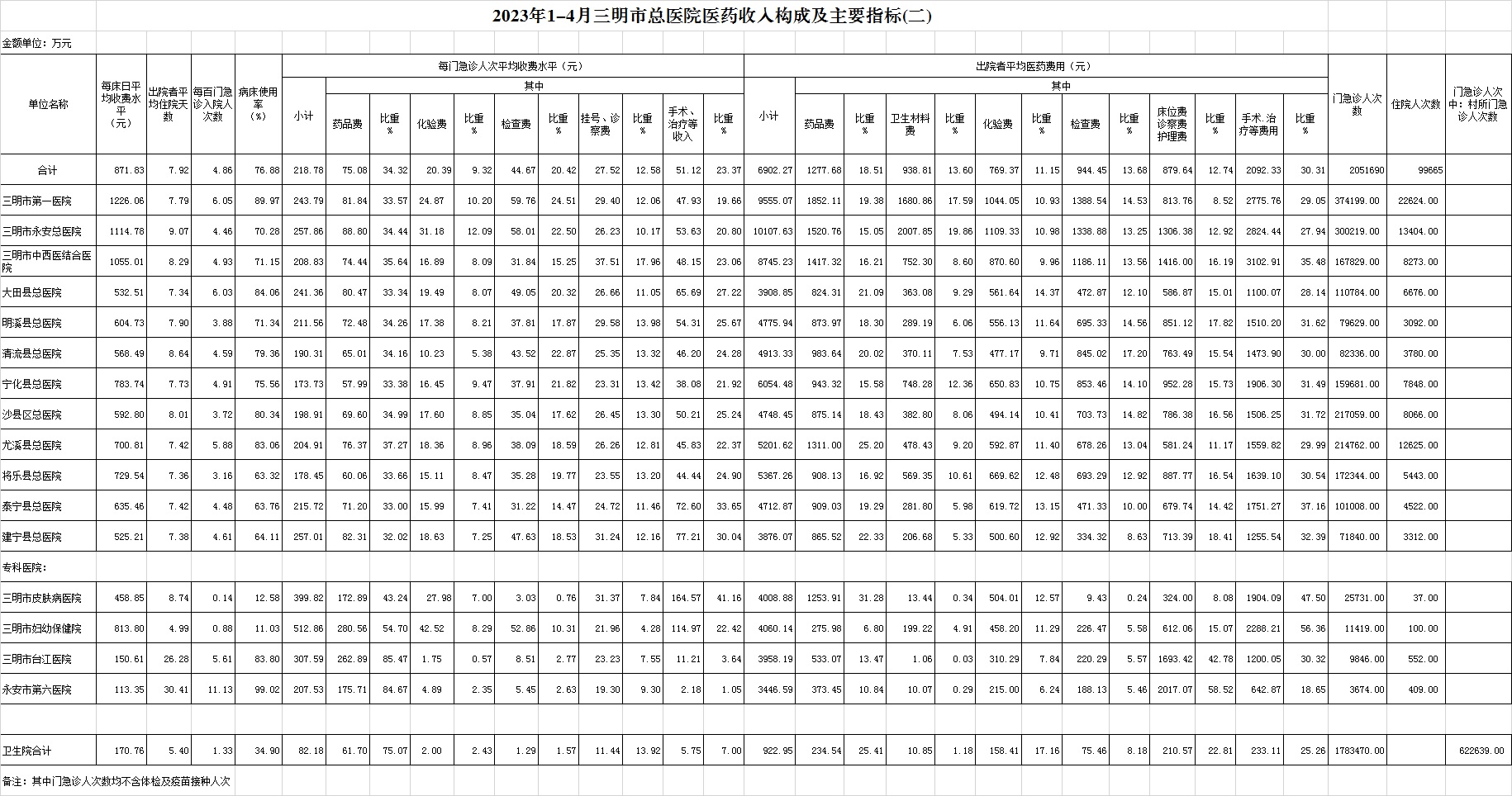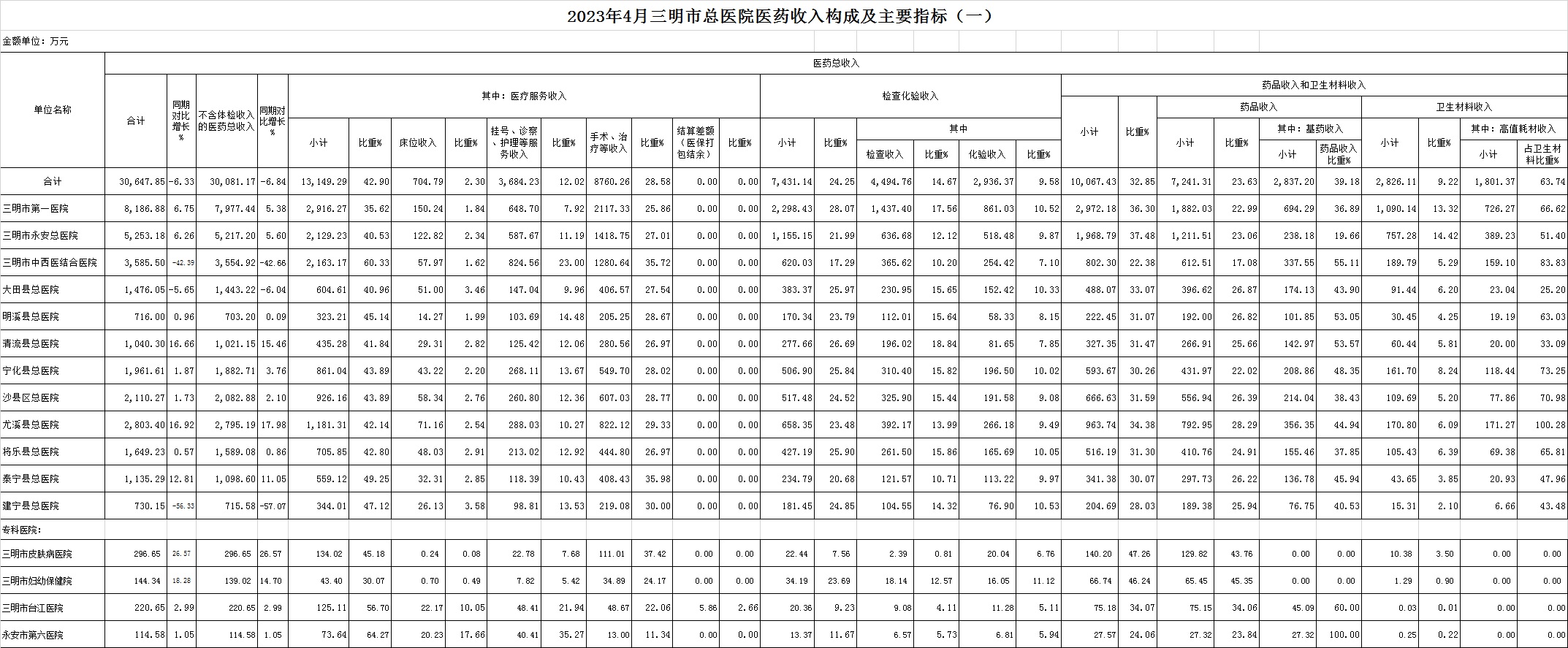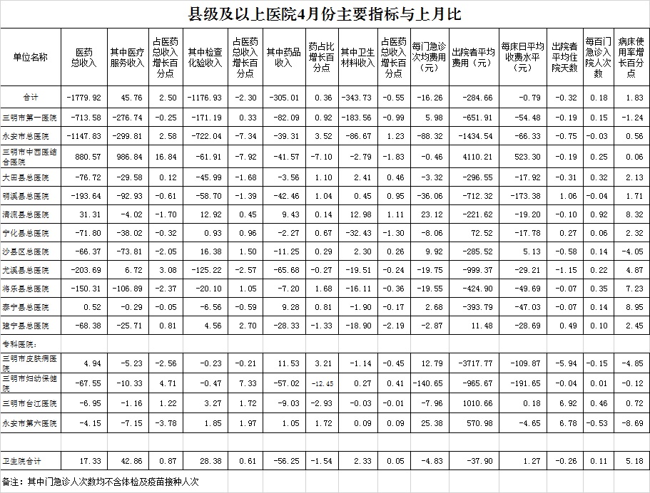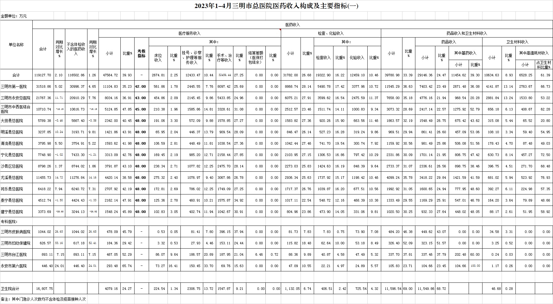 医药总收入。1-4月份12家总医院医药总收入同比增长2.10%(不含体检收入的医药收入同比增长1.26%),增长率超过考核要求(三级医院考核要求为10%,二级医院考核要求为8%)的有2家总医院,其中尤溪县总医院同比增长14.16%、明溪县总医院同比增长9.81%。