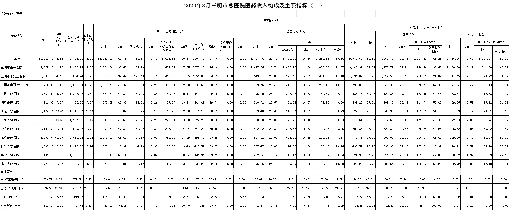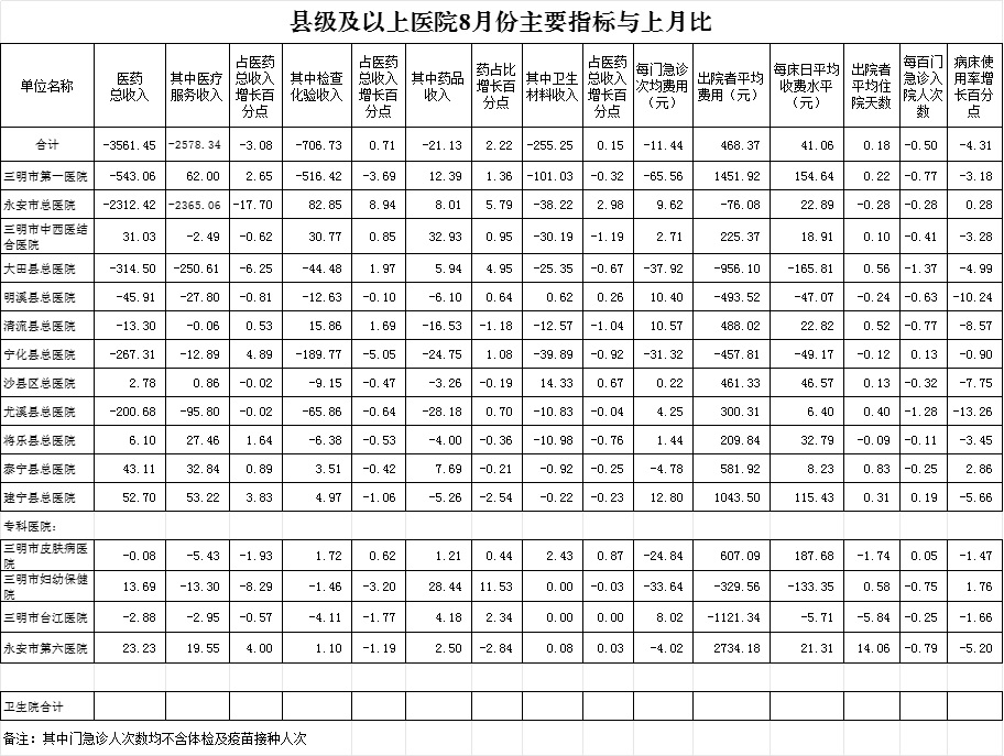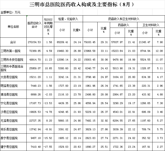 医药总收入。1-8月份12家总医院医药总收入同比增长1.58%,不含体检、疫苗接种和结算差额等收入的医药收入同比增长3.79%,增长率超过考核要求(三级医院考核要求为10%,二级医院考核要求为8%)的有2家总医院,其中清流县总医院同比增长11.32%、明溪县总医院同比增长9.18%。
