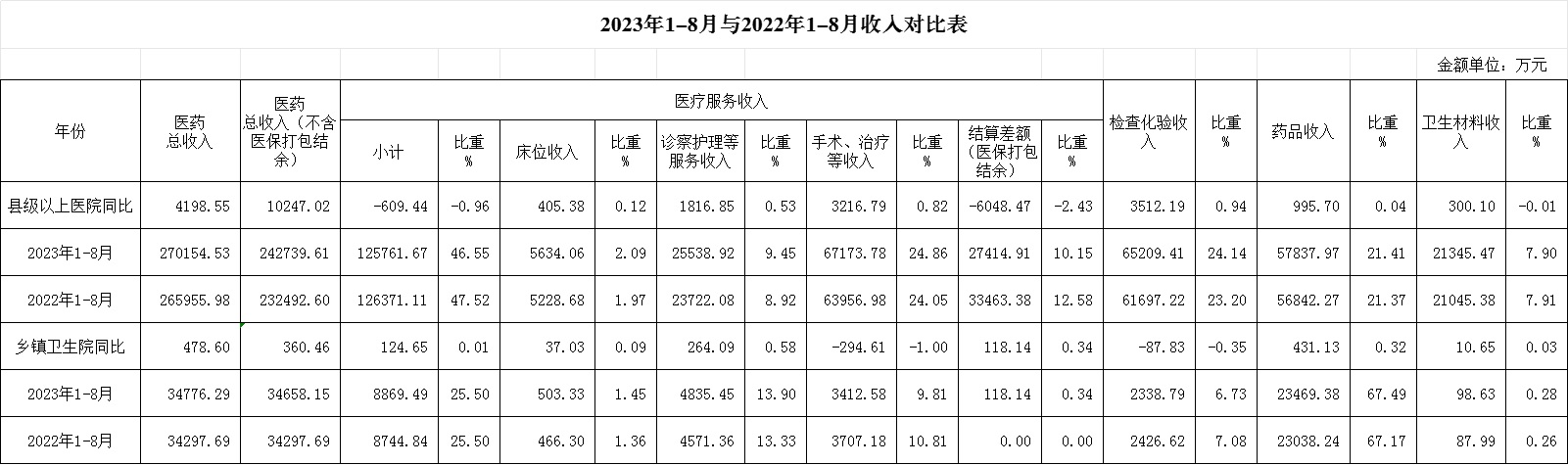 1.医药收入:8月份12家总医院医药总收入31440.82万元,比去年同期33219.95万元,减少1779.13万元,下降5.36%。其中:医疗服务性收入13241.21万元,占医药收入42.11%(床位收入731.56万元、手术治疗护理等服务收入12509.65万元),比去年同期15243.84万元, 医疗服务性收入减少2002.63万元,下降13.14%;药品收入7061.83万元,比去年同期7323.49万元,减少261.66万元,下降3.57%。