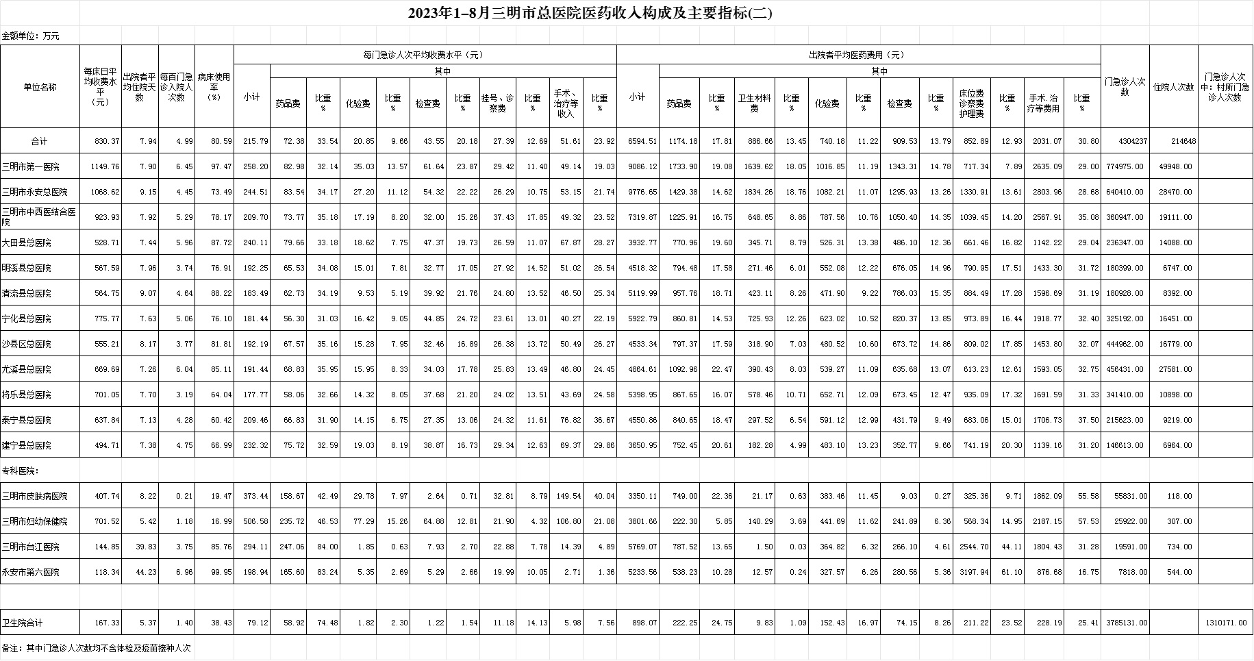 (一)1-8月份12家总医院运行情况:医药总收入270154.53万元,比去年同期265955.98万元增加4198.55万元,增长1.58%(不含体检、疫苗接种和结算差额等收入的医药收入为223195.16万元,比去年同期215048.37万元增加8146.79万元,增长3.79%)。其中:医疗服务性收入125761.67万元,占医药收入46.55%(床位收入5634.06万元、手术治疗护理等服务收入92712.70万元、结算差额27414.91万元),比去年同期126371.11万元,医疗服务性收入减少609.44万元,下降0.48%(不含结算差额的医疗服务性收入98346.76万元,占医药收入40.52%,比去年同期92907.73万元增加5439.03万元增长5.85%);检查化验收入65209.41万元,占医药收入24.14%,同比增长5.69%;药品收入57837.97万元,药占比21.41%,分别比去年同期增长1.75%、增长0.04个百分点;卫生材料收入21345.47万元(其中高值耗材收入12971.16万元),占医药总收入7.90%,比去年同期7.91%,下降0.01个百分点。入院人次214648人次,比去年同期187582人次,增加27066人次,增长14.43%;门急诊人次4304237人次,比去年同期4948002人次,减少643765人次,下降13.01%;每门诊次均费用215.79元,比去年同期191.67元,增加24.12元,增长12.59%;出院者平均费用6594.51元,比去年同期6967.53元,减少373.02元,下降5.35%。
