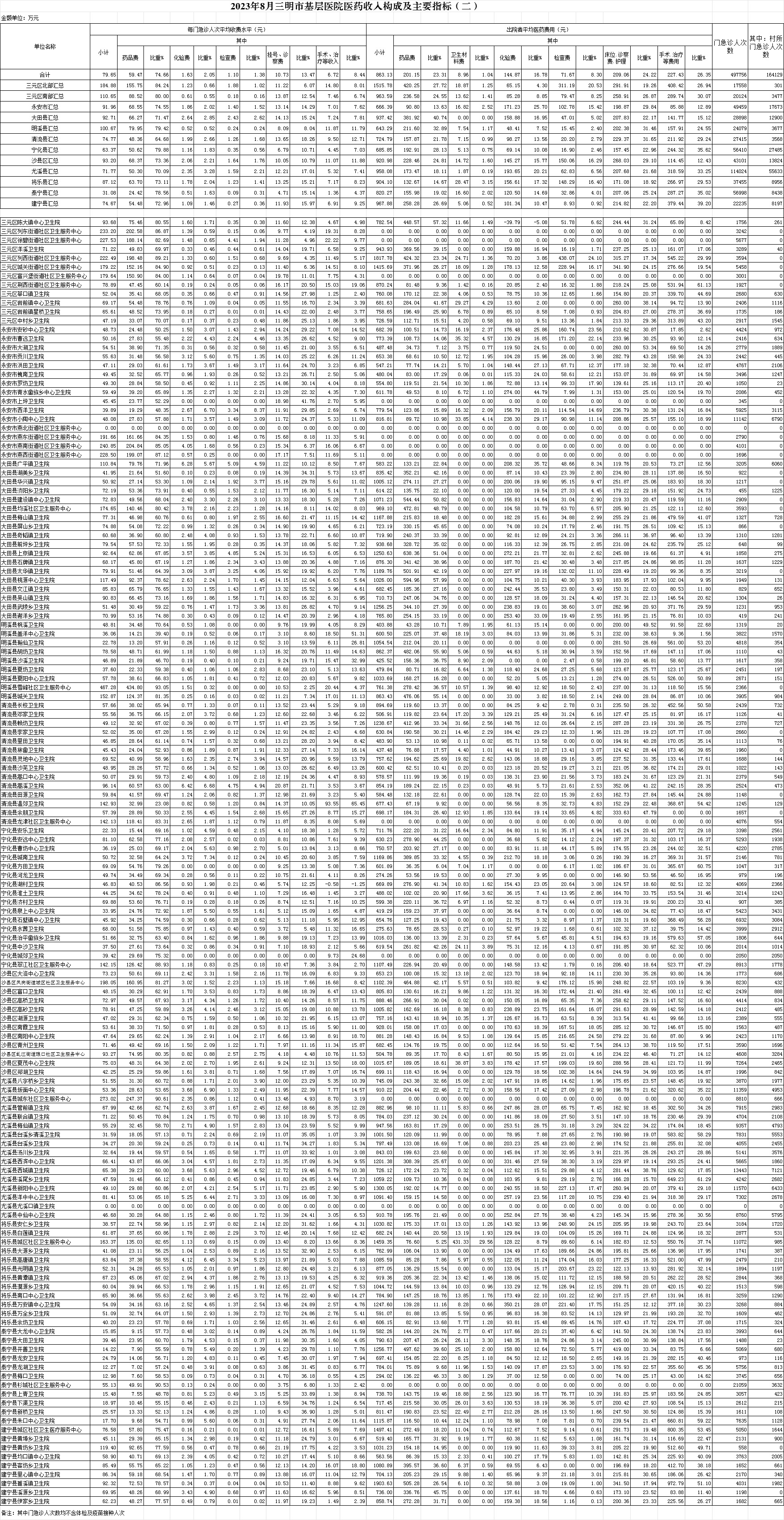 1-8月份基层医疗机构医药总收入34776.29万元(其中村所收入3985.35万元),去年同期34297.69万元,同比增加478.60万元,增长1.40%,其中:医疗服务性收入8869.49万元,占医药收入25.50%(床位收入503.33万元、手术治疗护理等服务收入8366.16万元),去年同期8744.84万元, 医疗服务性收入同比增加124.65万元,增长1.43%;检查化验收入2338.79万元,同比下降3.62%;药品收入23469.38万元,去年同期23038.24万元,同比增加431.13万元,增长1.87%,药占比67.49%,去年同期67.17%,同比增长0.32个百分点;卫生材料收入98.63万元,较去年同期87.99万元,同比增加10.65万元,占医药收入0.28%,较去年同期0.26%,同比增长0.03个百分点。入院人次52870人次,去年同期49282人次,同比增加3588人次,增长7.28%,其中宁化县、泰宁县、清流县分别下降40.44%、19.59%、19.2%、;门急诊人次3785131人次(其中村所门急诊1310171人次),去年同期3589153人次,同比增加195978人次,增长5.46%,其中:清流县、大田县分别下降7%、0.69%;基层诊疗量占比为46.79%,较去年同期的42.04%增长4.75个百分点);每门诊次均费用79.12元,去年同期83.45元,同比减少4.33元,下降5.19%;出院者平均费用898.07元,去年同期872.56元,同比增加25.51元,增长2.92%。