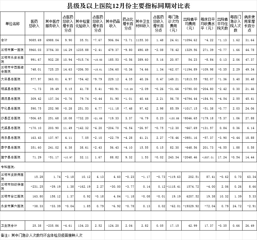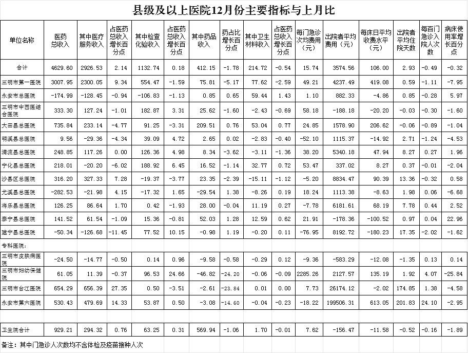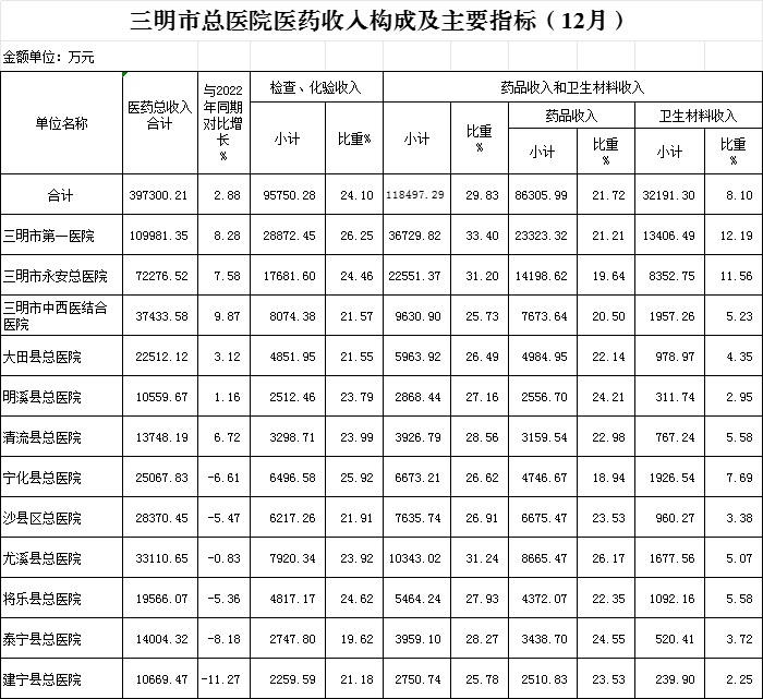 医疗服务性收入占比。1-12月份12家总医院医疗服务性收入占医药总收入46.07%,其中:市第一医院40.35%、三明市永安总医院44.33%、市中西医结合医院52.7%、大田县总医院51.96%、明溪县总医院49.04%、清流县总医院47.44%、宁化县总医院47.46%、沙县总医院51.17%、尤溪县总医院44.84%、将乐县总医院47.45%、泰宁县总医院52.11%、建宁县总医院53.04%。