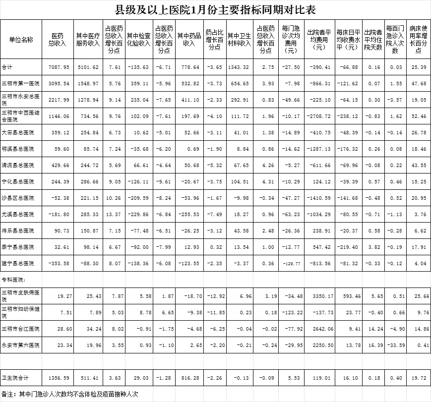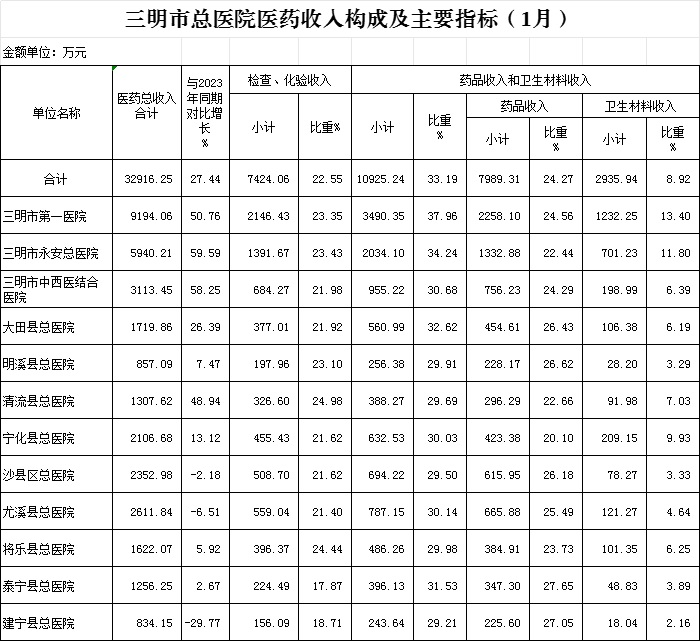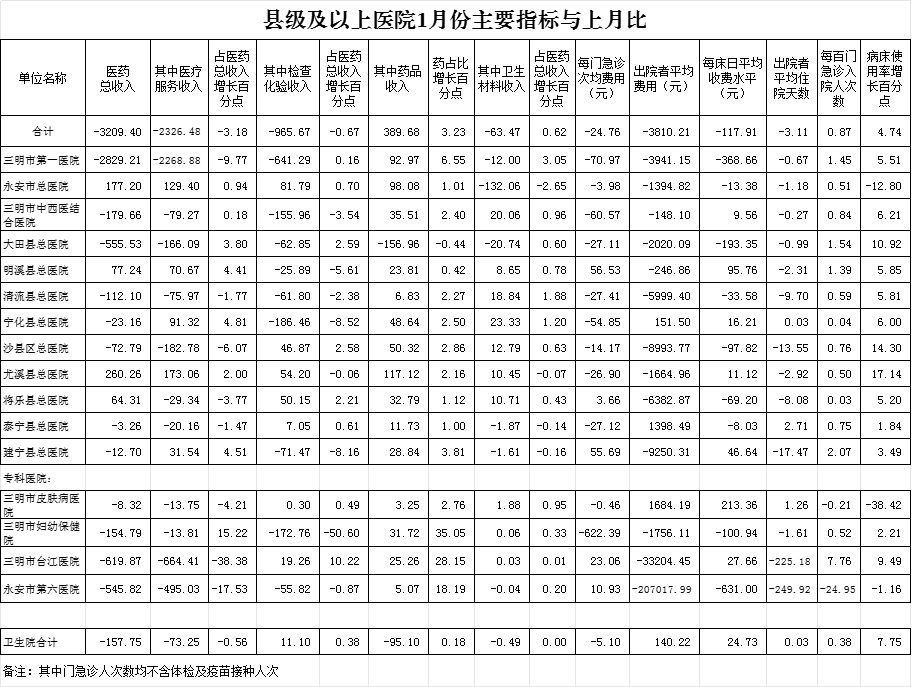 医药总收入。1月份12家总医院医药总收入同比增长27.44%(不含体检、疫苗接种和结算差额等收入的医药收入同比增长25.08%),增长率超过考核要求(三级医院考核要求为10%,二级医院考核要求为8%)的有4家总医院,其中市中西医结合医院同比增长58.02%、市永安总医院同比增长53.83%、市第一医院医院同比增长51.29%、清流县总医院同比增长42.48%。