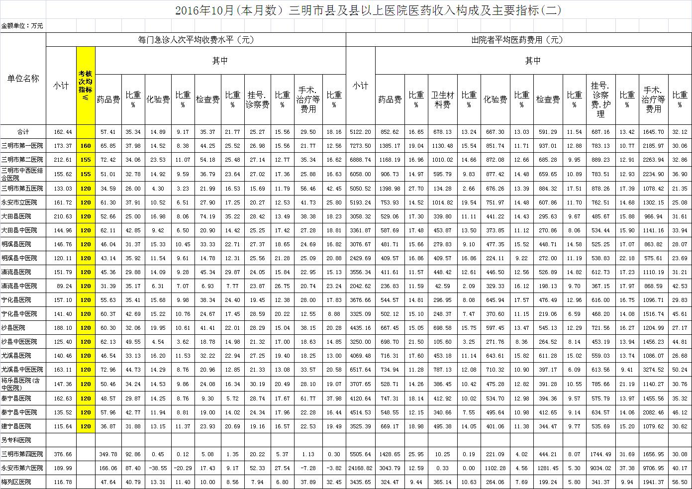 次均费用。10月份21家县级以上医院每门诊次均费用162.44元,比去年同期的156.23元,增加6.21元。达标医院2家,超标19家,其中大田县医院超过90.63元、沙县医院超过68.10元、市第二医院超过57.61元;出院者平均费用5122.20元,比去年同期5202元,减少79.8元。