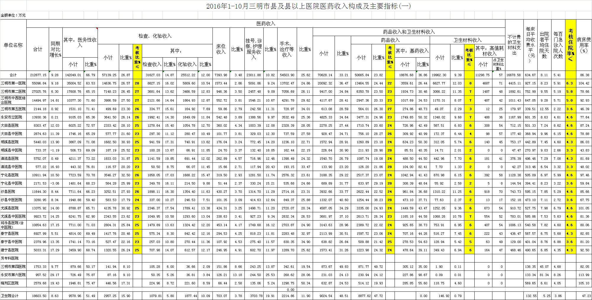住院率。10月份21家县级以上医院住院率5.54%,比去年同期5.74%,下降0.20个百分点,达标医院有7家,超标14家,其中泰宁县中医院超过4.42个百分点、大田县医院超过4.12个百分点、尤溪县医院超过2.5个百分点。