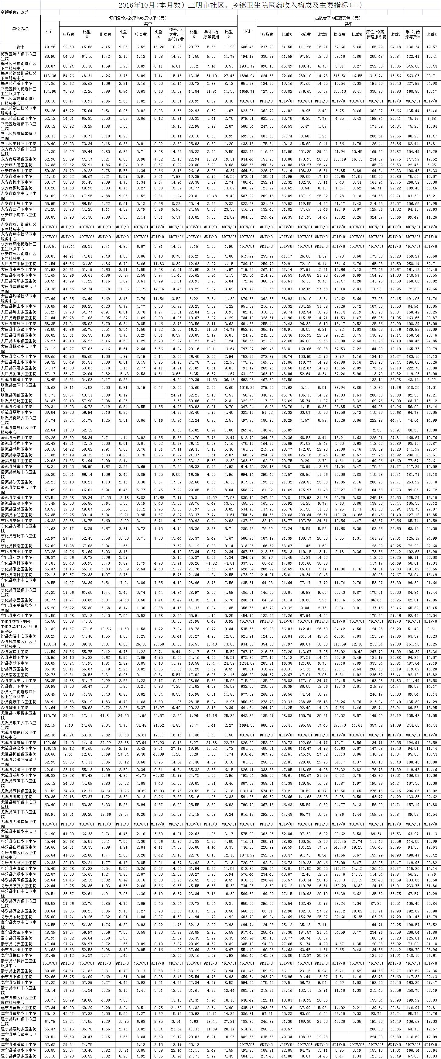 1. 医药收入:10月份21家县级以上医院医药总收入22156.40万元,比去年同期19908.04万元,增加2248.36万元,增长11.29%。其中:医务性收入14984.53万元,占医药收入67.63%(检查化验收入5950.38万元、床位收入767.43万元、手术治疗护理等服务收入8266.72万元),比去年同期13218.39万元, 医务性收入增加1766.14万元,增长13.36%;药品收入5174.31万元,比去年同期4870.87万元,增加303.44万元,增长6.23%。