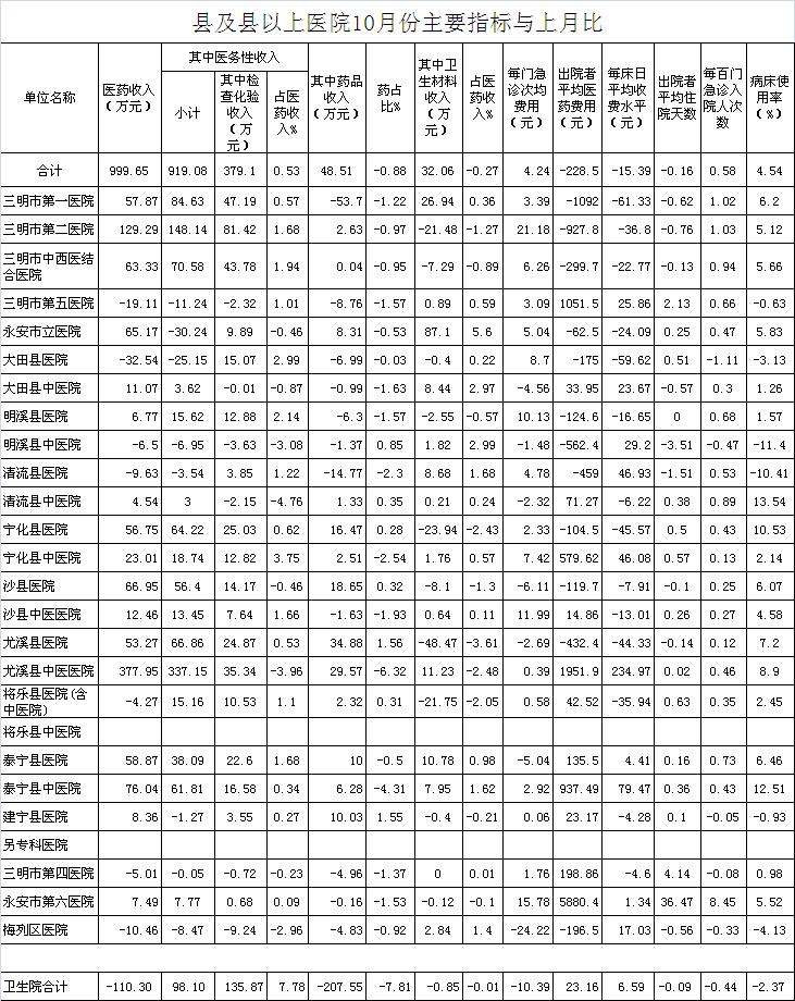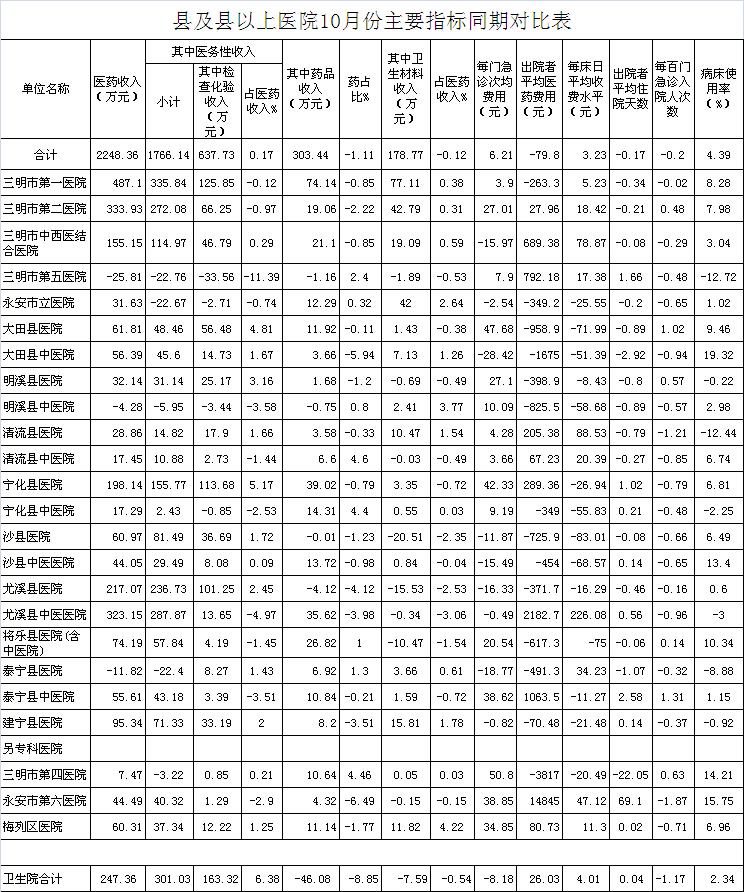 医药总收入。1-10月份21家县级以上医院医药总收入同比增长9.28%,增长超过8%有14家医院,其中建宁县医院同比增长17.29%、将乐县医院同比增长17.15%、清流县中医院同比增长16.93%。