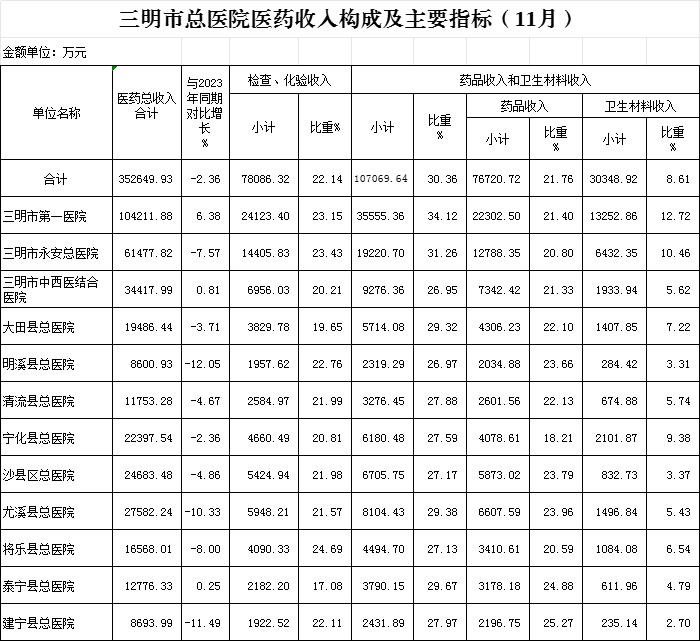 医疗服务性收入占比。1-11月份12家总医院医疗服务性收入占医药总收入47.50%,其中:市第一医院42.73%、三明市永安总医院45.3%、市中西医结合医院52.84%、大田县总医院51.02%、明溪县总医院50.27%、清流县总医院50.13%、宁化县总医院51.6%、沙县总医院50.86%、尤溪县总医院49.05%、将乐县总医院48.18%、泰宁县总医院53.25%、建宁县总医院49.91%,所有医院均完成了考核指标。