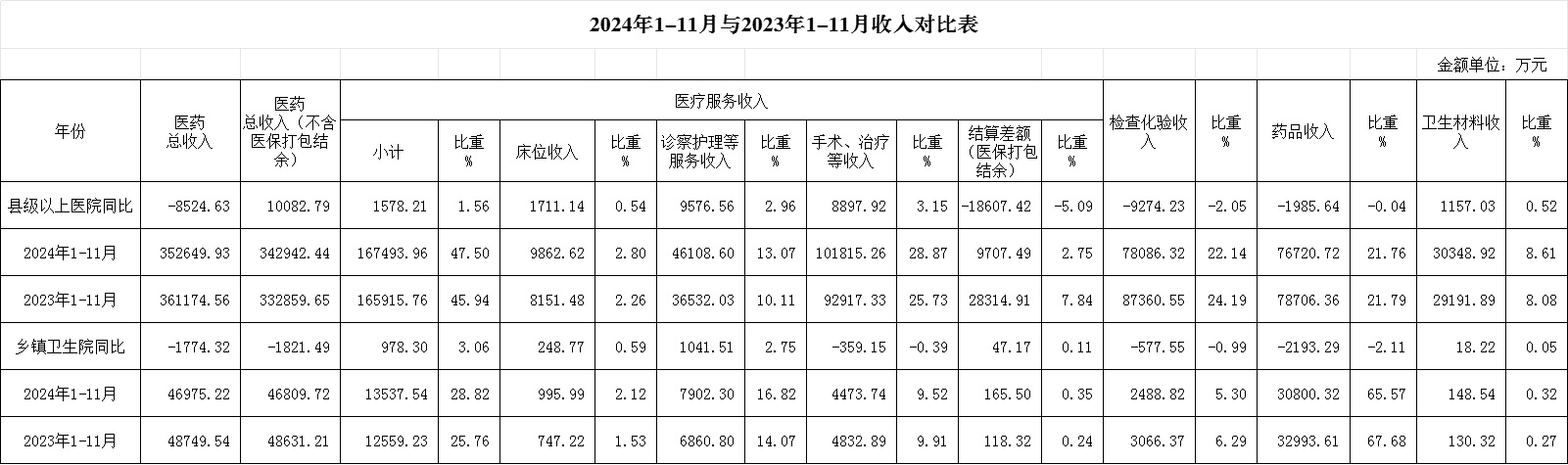 (一)1-11月份12家总医院运行情况:医药总收入352649.93万元,比去年同期361174.56万元减少8524.63万元,下降2.36%(不含体检、疫苗接种和结算差额等收入的医药收入为304180.68万元,比去年同期305049.46万元,减少868.78万元,下降0.28%)。其中:医疗服务性收入167493.96万元,占医药收入47.50%(床位收入9862.62万元、手术治疗护理等服务收入147923.85万元,结算差额9707.49万元),比去年同期165915.76万元,医疗服务性收入增加1578.21万元,增长0.95%;检查化验收入78086.32万元,占医药收入22.14%,同比下降10.62%;药品收入76720.72万元,药占比21.76%,分别比去年同期下降2.52%、下降0.04个百分点;卫生材料收入30348.92万元(其中高值耗材收入15158.63万元),占医药总收入8.61%,比去年同期8.08%,增长0.52个百分点。入院人次296092人次,比去年同期297569人次,减少1477人次,下降0.50%;门急诊人次6205582人次,比去年同期6017073人次,增加188509人次,增长3.13%;每门诊次均费用209.80元,比去年同期211.88元,减少2.08元,下降0.98%;出院者平均费用6871.46元,比去年同期6554.54元,增加316.91元,增长4.84%。