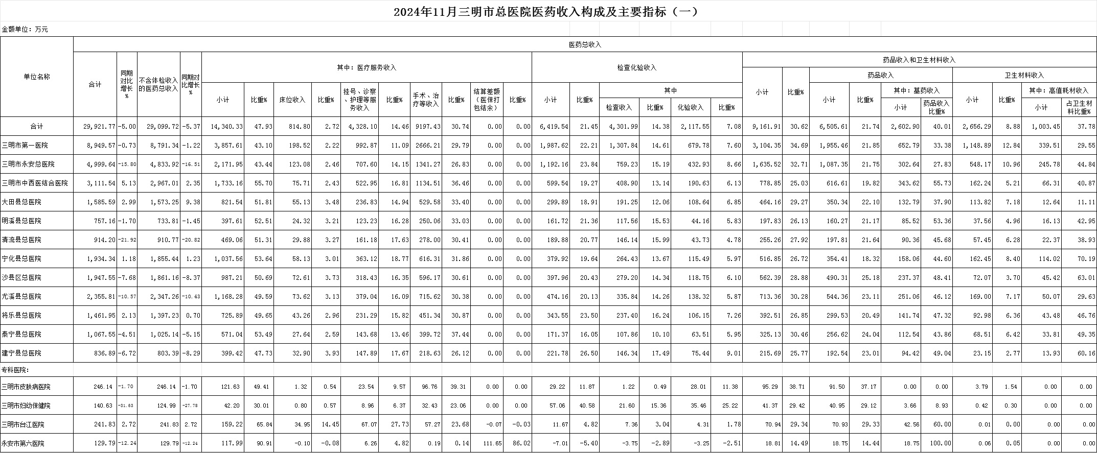 1.医药收入:11月份12家总医院医药总收入29921.77万元,比去年同期31496.05万元,减少1574.28万元,下降5.00%。其中:医疗服务性收入14340.33万元,占医药收入47.93%(床位收入814.80万元、手术治疗护理等服务收入13525.53万元),比去年同期14266.90万元, 医疗服务性收入增加73.43万元,增长0.51%;药品收入6505.61万元,比去年同期7187.48万元,减少681.87万元,下降9.49%。