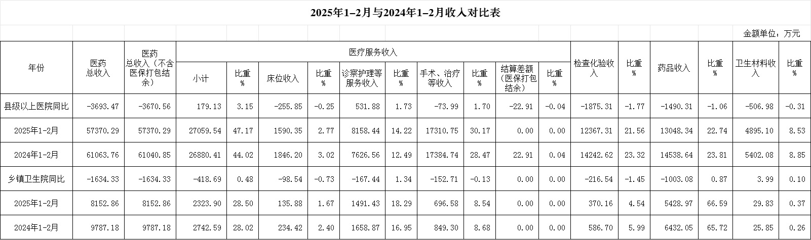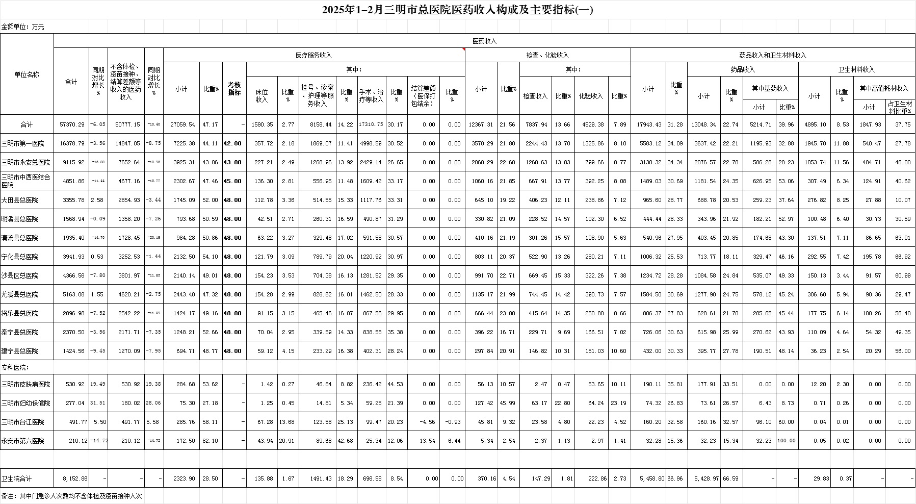 (一)1-2月份12家总医院运行情况:医药总收入57370.29万元,比去年同期61063.76万元减少3693.47万元,下降6.05%(不含体检、疫苗接种和结算差额等收入的医药收入为50777.15万元,比去年同期56671.6万元,减少5894.45万元,下降10.4%)。其中:医疗服务性收入27059.54万元,占医药收入47.17%(床位收入1590.35万元、手术治疗护理等服务收入25469.19万元),比去年同期26880.41万元,医疗服务性收入增加179.13万元,增长0.67%;检查化验收入12367.31万元,占医药收入21.56%,同比下降13.17%;药品收入13048.34万元,药占比22.74%,分别比去年同期下降10.25%、下降1.06个百分点;卫生材料收入4895.10万元(其中高值耗材收入1847.93万元),占医药总收入8.53%,比去年同期8.85%,下降0.31个百分点。入院人次50693人次,比去年同期59678人次,减少8985人次,下降15.06%;门急诊人次1095084人次,比去年同期1129341人次,减少34257人次,下降3.03%;每门诊次均费用201.23元,比去年同期197.67元,增加3.56元,增长1.80%;出院者平均费用6853.62元,比去年同期6305.75元,增加547.87元,增长8.69%。