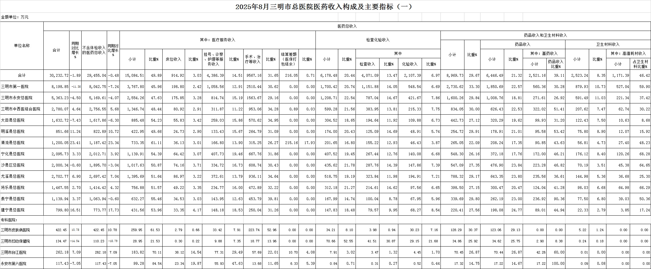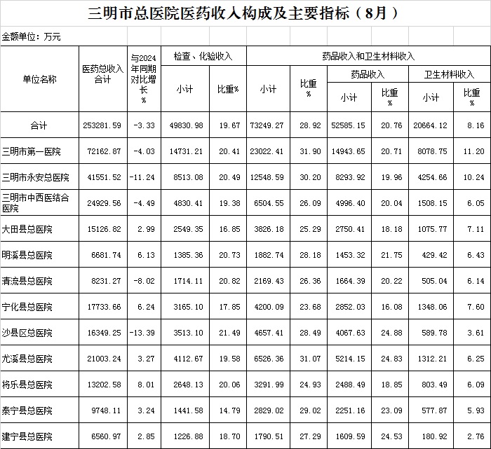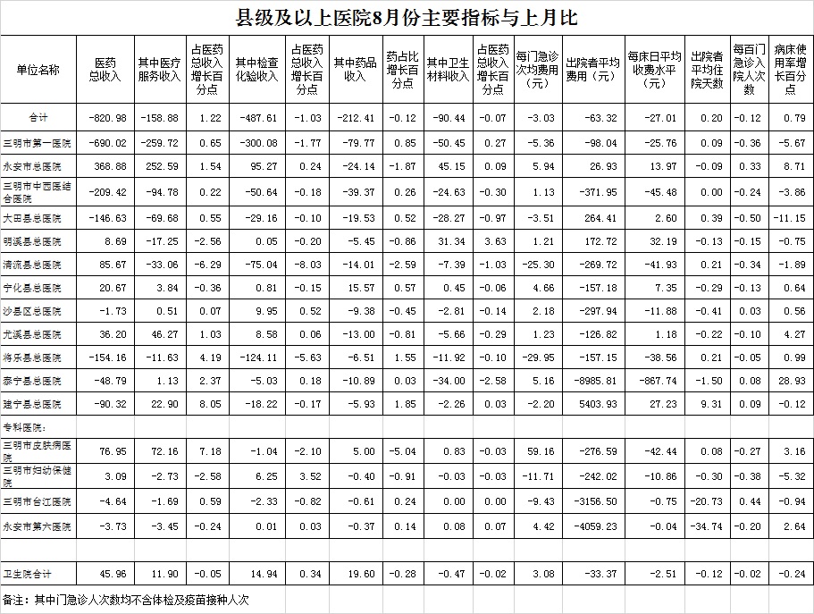 医药总收入。1-8月份12家总医院医药总收入同比下降3.33%(不含体检、疫苗接种和结算差额等收入的医药收入同比下降9.84%),增长率超过考核要求(三级医院考核要求为10%,二级医院考核要求为8%)的有1家总医院,其中将乐县总医院同比增长8.01%。