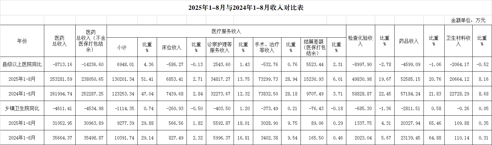 (一)1-8月份12家总医院运行情况:医药总收入253281.59万元,比去年同期261994.74万元减少8713.16万元,下降3.33%(不含体检、疫苗接种和结算差额等收入的医药收入为207808.79万元,比去年同期230487.13万元,减少22678.34万元,下降9.84%)。其中:医疗服务性收入130201.34万元,占医药收入51.41%(床位收入6853.41万元、手术治疗护理等服务收入108117.00万元、结算差额15230.93万元),比去年同期123253.34万元,医疗服务性收入增加6948.01万元,增长5.64%;检查化验收入49830.98万元,占医药收入19.67%,同比下降15.30%;药品收入52585.15万元,药占比20.76%,分别比去年同期下降8.04%、下降1.06个百分点;卫生材料收入20664.12万元(其中高值耗材收入10503.23万元),占医药总收入8.16%,比去年同期8.68%,下降0.52个百分点。入院人次203758人次,比去年同期224923人次,减少21165人次,下降9.41%;门急诊人次4548509人次,比去年同期4554744人次,减少6235人次,下降0.14%;每门诊次均费用203.56元,比去年同期209.29元,减少5.73元,下降2.74%;出院者平均费用6879.43元,比去年同期6651.68元,增加227.75元,增长3.42%。