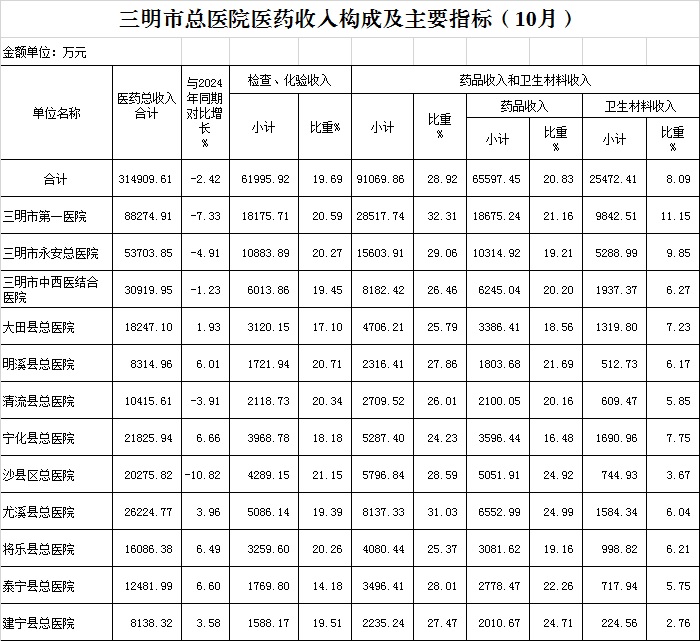 医疗服务收入占比。1-10月份12家总医院医疗服务收入占医药总收入51.39%,其中:市第一医院47.10%、三明市永安总医院50.68%、市中西医结合医院54.09%、大田县总医院57.11%、明溪县总医院51.43%、清流县总医院53.64%、宁化县总医院57.59%、沙县总医院50.26%、尤溪县总医院49.58%、将乐县总医院54.37%、泰宁县总医院57.81%、建宁县总医院53.02%,所有总医院均完成了考核指标。