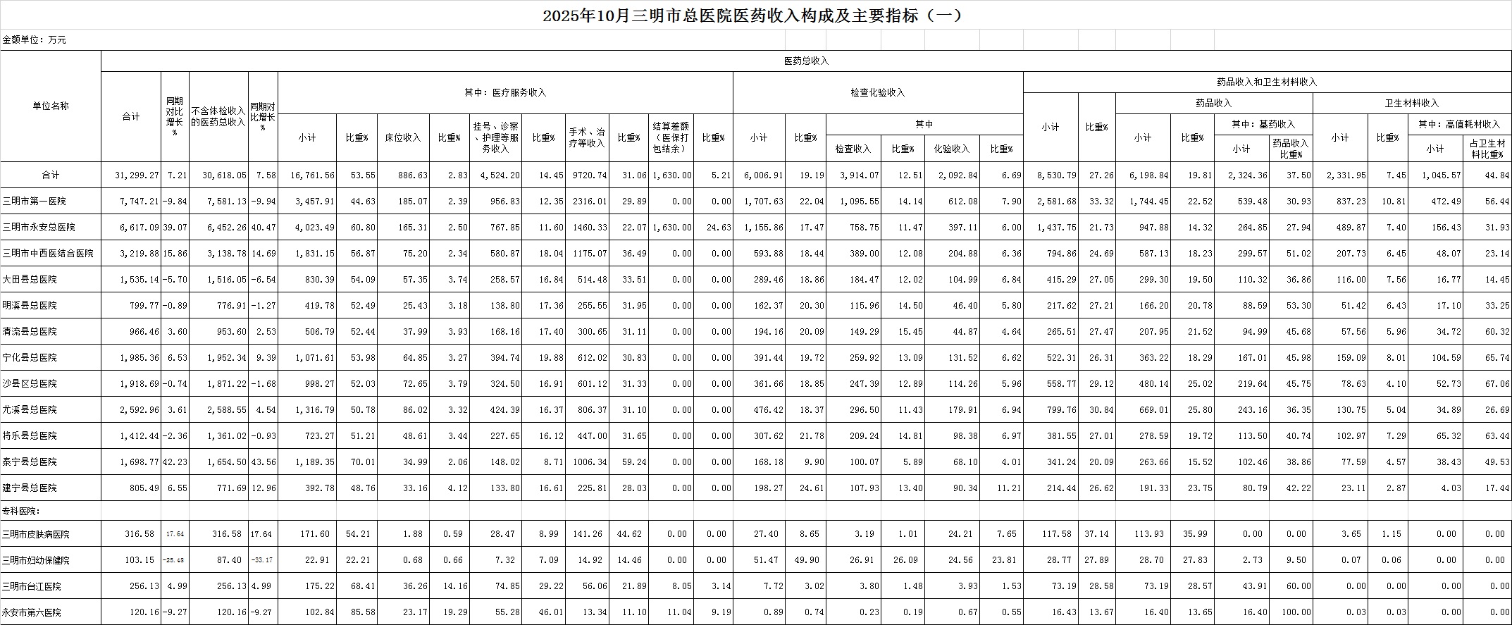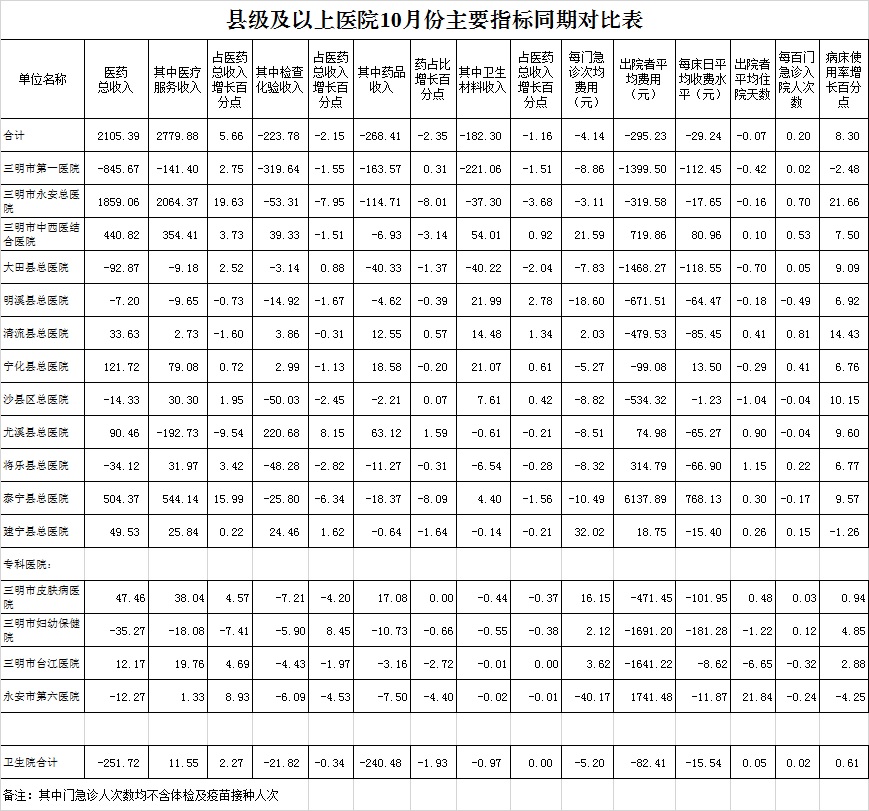 1.医药收入:10月份12家总医院医药总收入31299.27万元,比去年同期29193.88万元,增加2105.39万元,增长7.21%。其中:医疗服务收入16761.56万元,占医药收入53.55%(床位收入886.63万元、手术治疗护理等服务收入14244.94万元、结算差额1630万元),比去年同期13981.68万元, 医疗服务收入增加2779.88万元,增长19.88%;药品收入6198.84万元,比去年同期6467.25万元,减少268.41万元,下降4.15%。