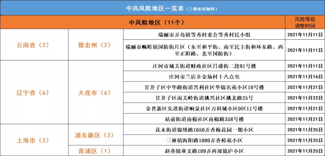 截至11月28日17时,全国中风险地区11个(详见中高风险地区一览表 )。